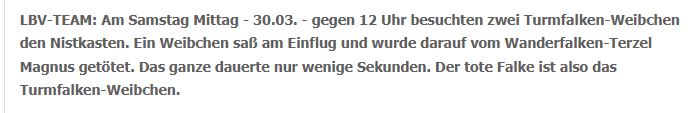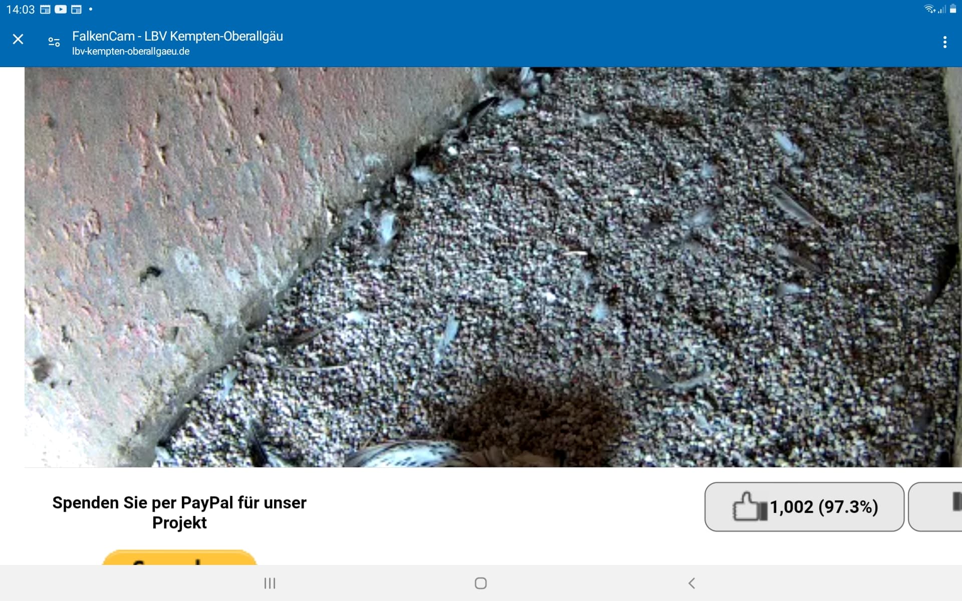 [https://www.lbv-kempten-oberallgaeu.de/falkencam.html 7](https://www.lbv-kempten-oberallgaeu.de/falkencam.html 7) was ist da los? Liegt da ein toter Falke im Eingangsbereich? Ich konnte keine Bewegung erkennen. ![]()