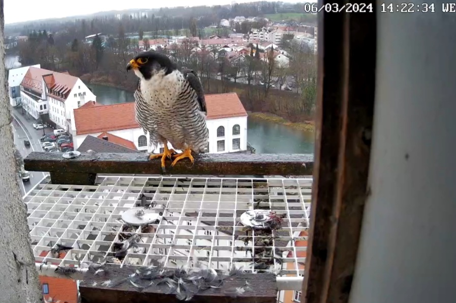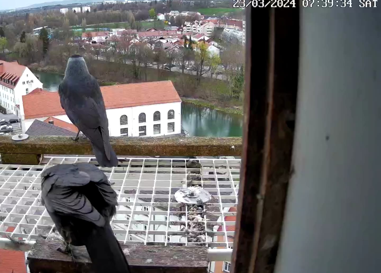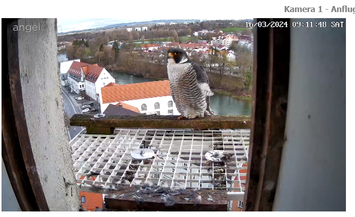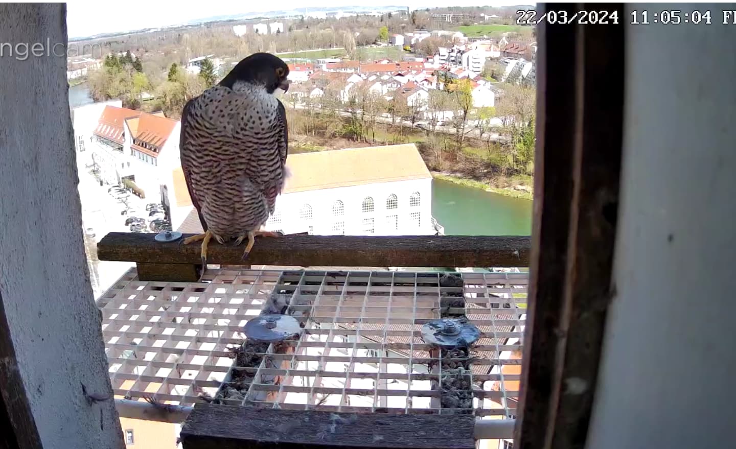 Wenn die Wanderfalken Petra und Magnus nicht bald mit der Brut anfangen, wird ihr Kasten evtl. anderweitig genutzt. Erste Interessenten sind schon da um 7.40 Uhr.
