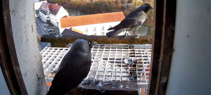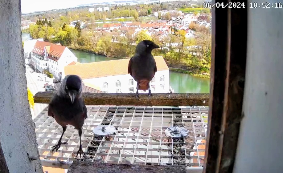 Kurz vor 9 Uhr schaute das Dohlenpaar wieder nach, ob die Nisthilfe noch frei ist.
