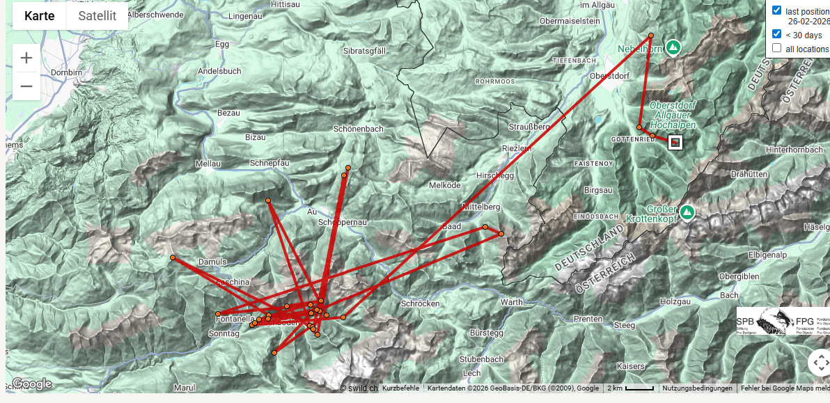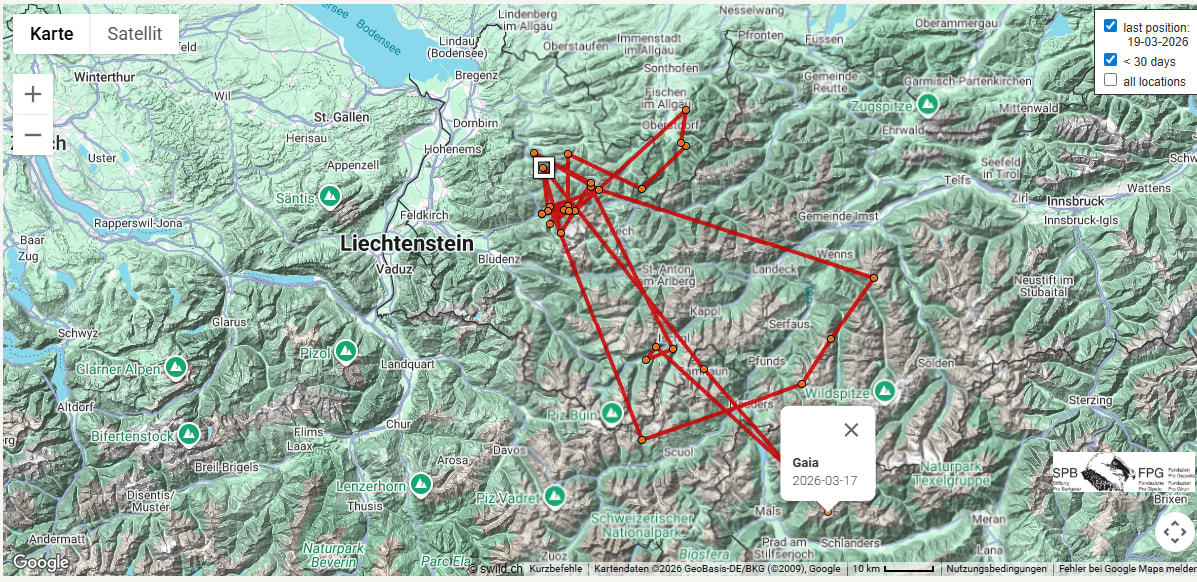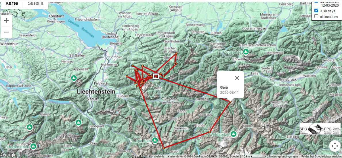 Gaia ist bis nach Tirol geflogen, ihr Sendepunkt vom 12.04.2025 liegt in den Ötztaler Alpen. https://www.bartgeier.ch/gaia