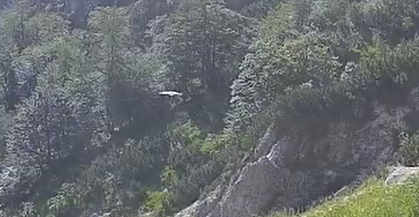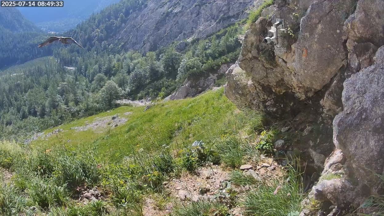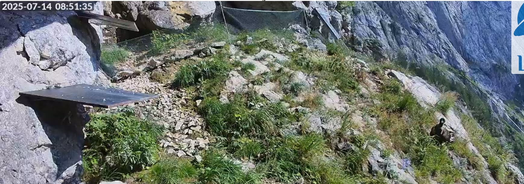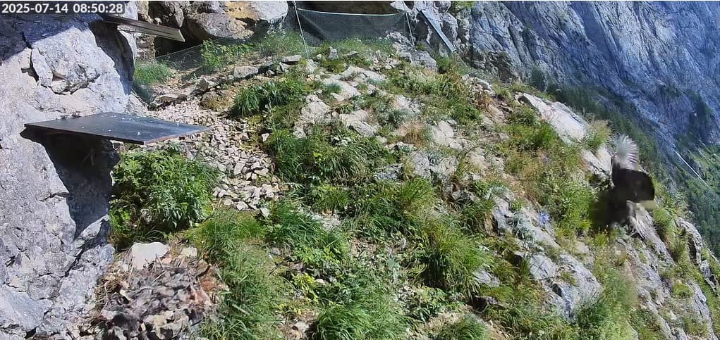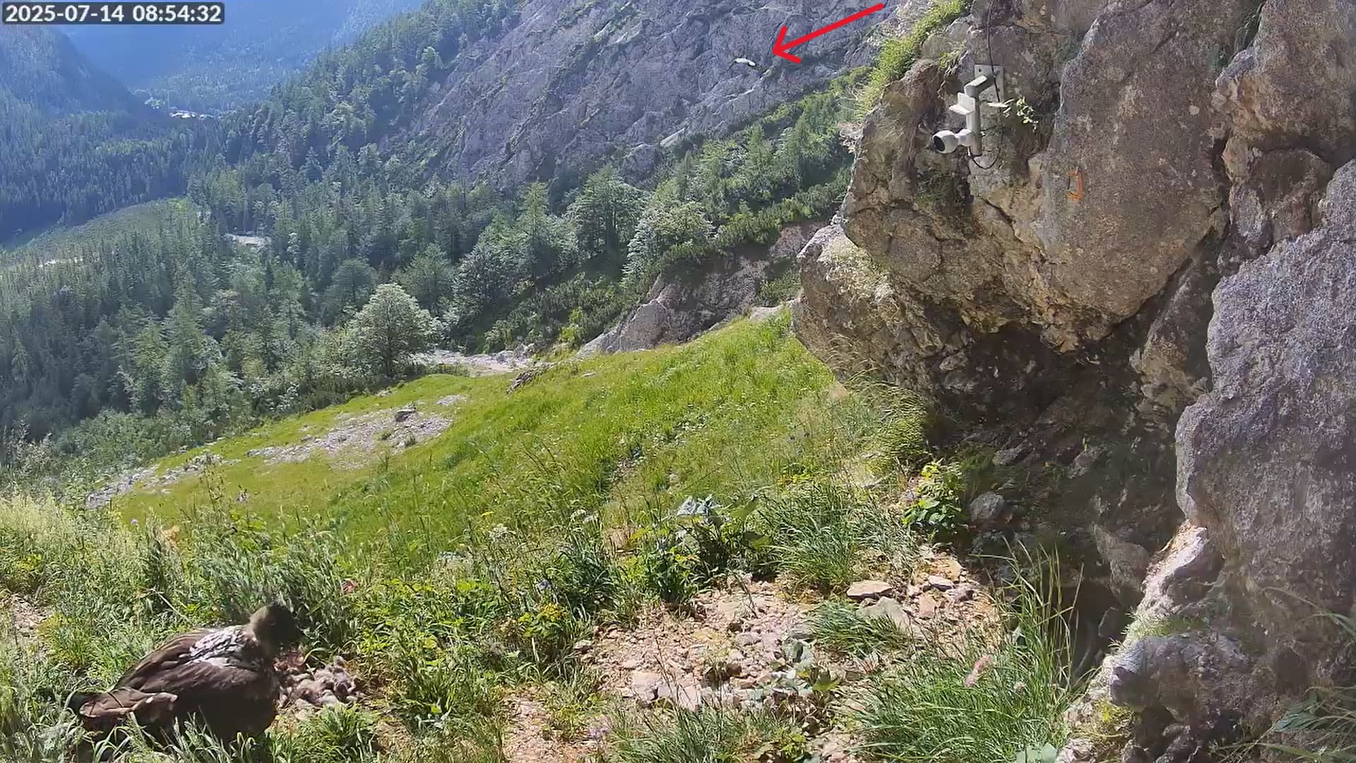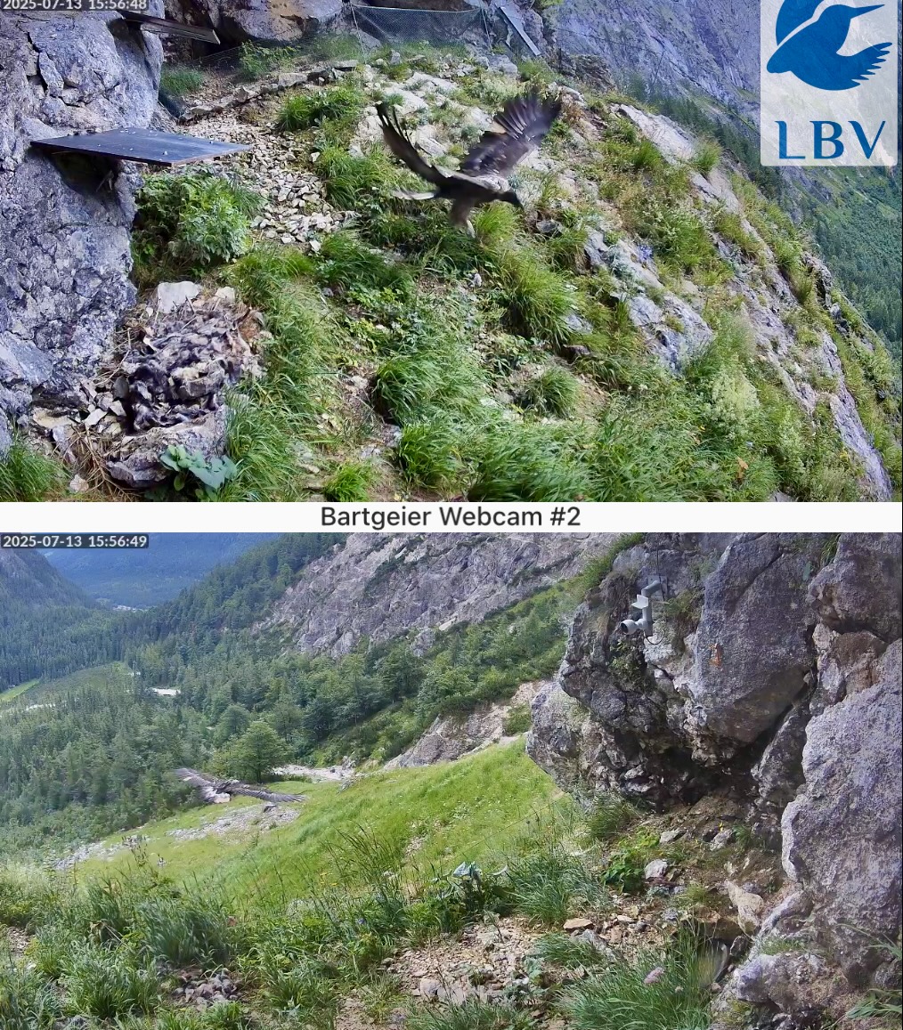 1 Barti ist in der Rinne gestartet und hat sich senkrecht vor den Felsen ohne Flügelschlag hochtragen lassen aus dem Blickfeld von Cam2 hinaus (wahrscheinlich Thermikschlauch).