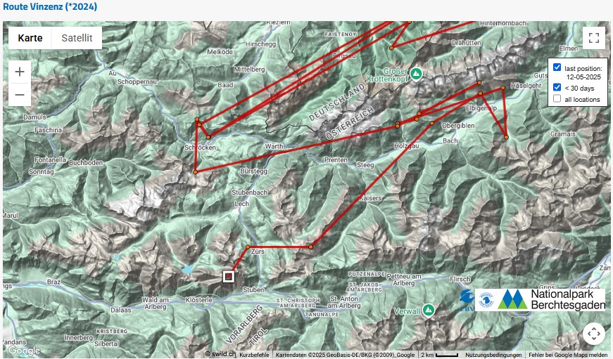 Am 04.05. war der letzte Sendepunkt von Vinzenz nur wenig entfernt von Gaia (aus der Schweizer Auswilderung 2024) Gaia | Stiftung Pro Bartgeier