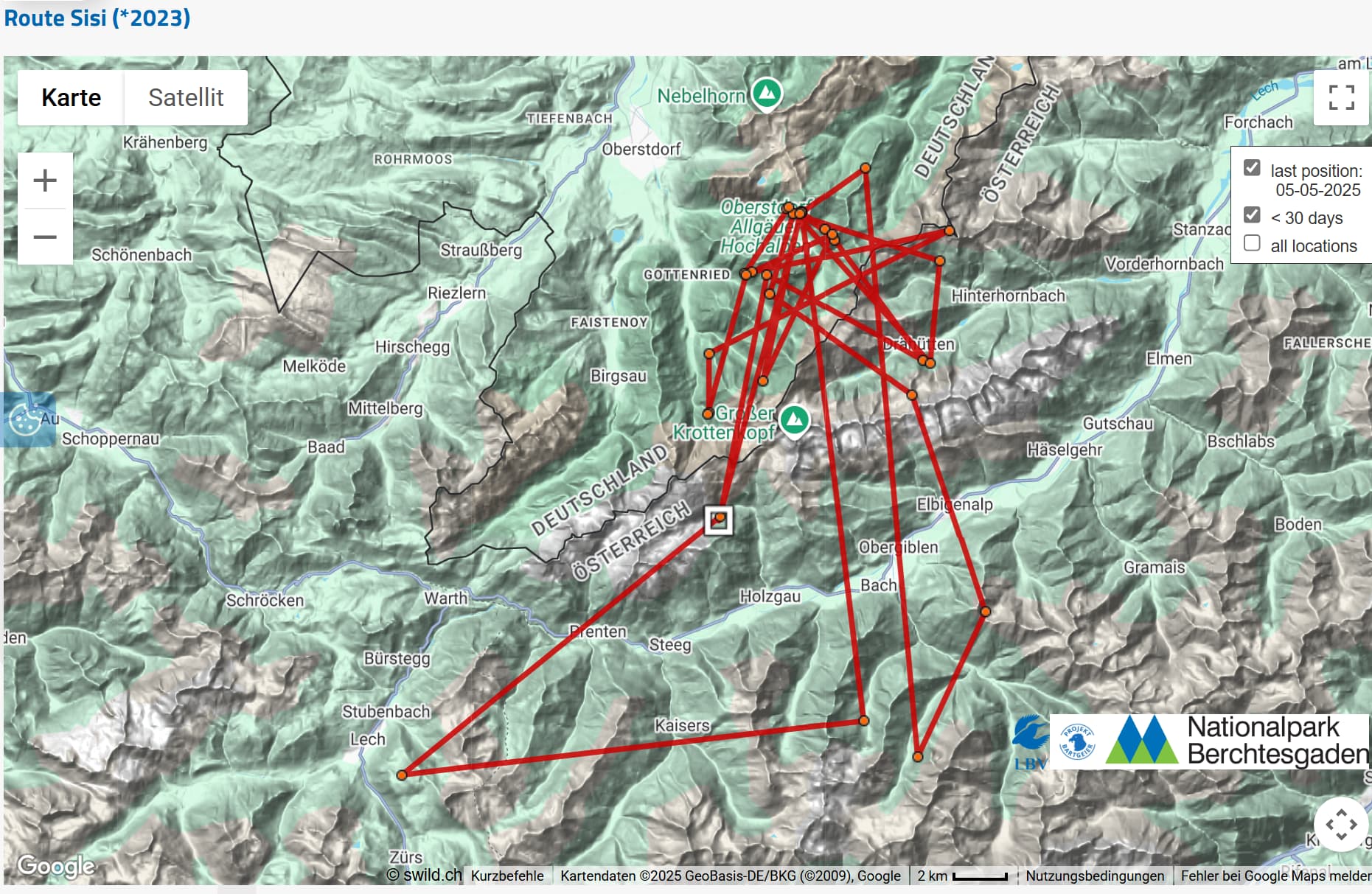 Sisi hat am 12.05. einen Ausflug ins Paznauntal (bei Galtür) gemacht (davon habe ich keinen Screenshot gemacht), aber sie ist dann offenbar wieder zurückgeflogen - ihr Sendepunkt hat sich nochmal geändert und liegt im Oberinntal bei Zams.