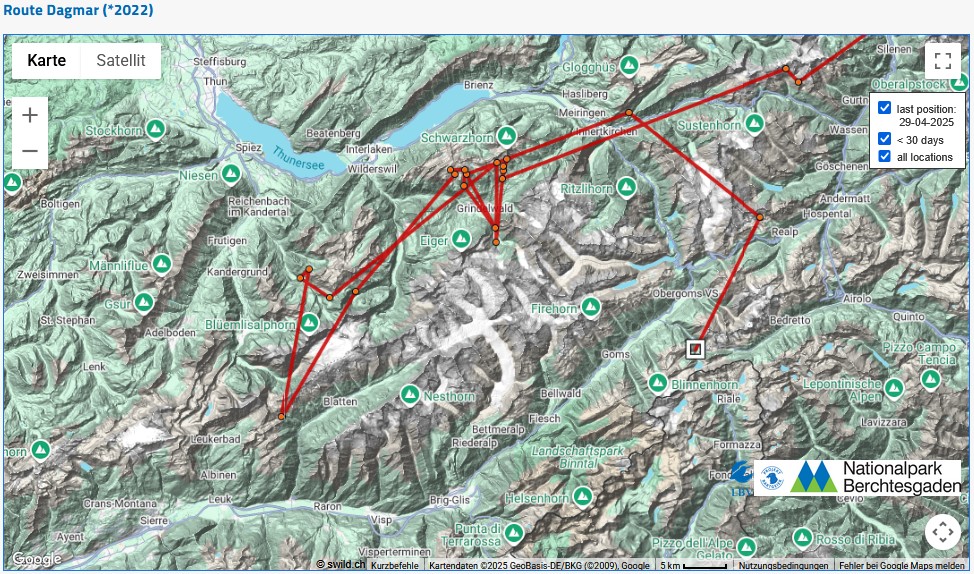 Mal wieder neue Daten von Dagmar (auch wenn sie noch nicht ganz auf dem neuesten Stand sind): Sie war am 29.04. immer noch in der Schweiz.