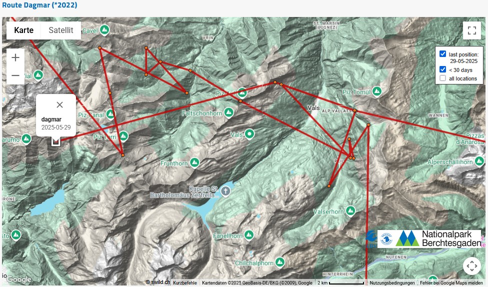 Neue Daten von Dagmar. Sie ist immer noch in einer Region der Schweiz unterwegs, die sie schon aus 2023 und 2024 gut kennt (müsste der Westen von Graubünden sein):