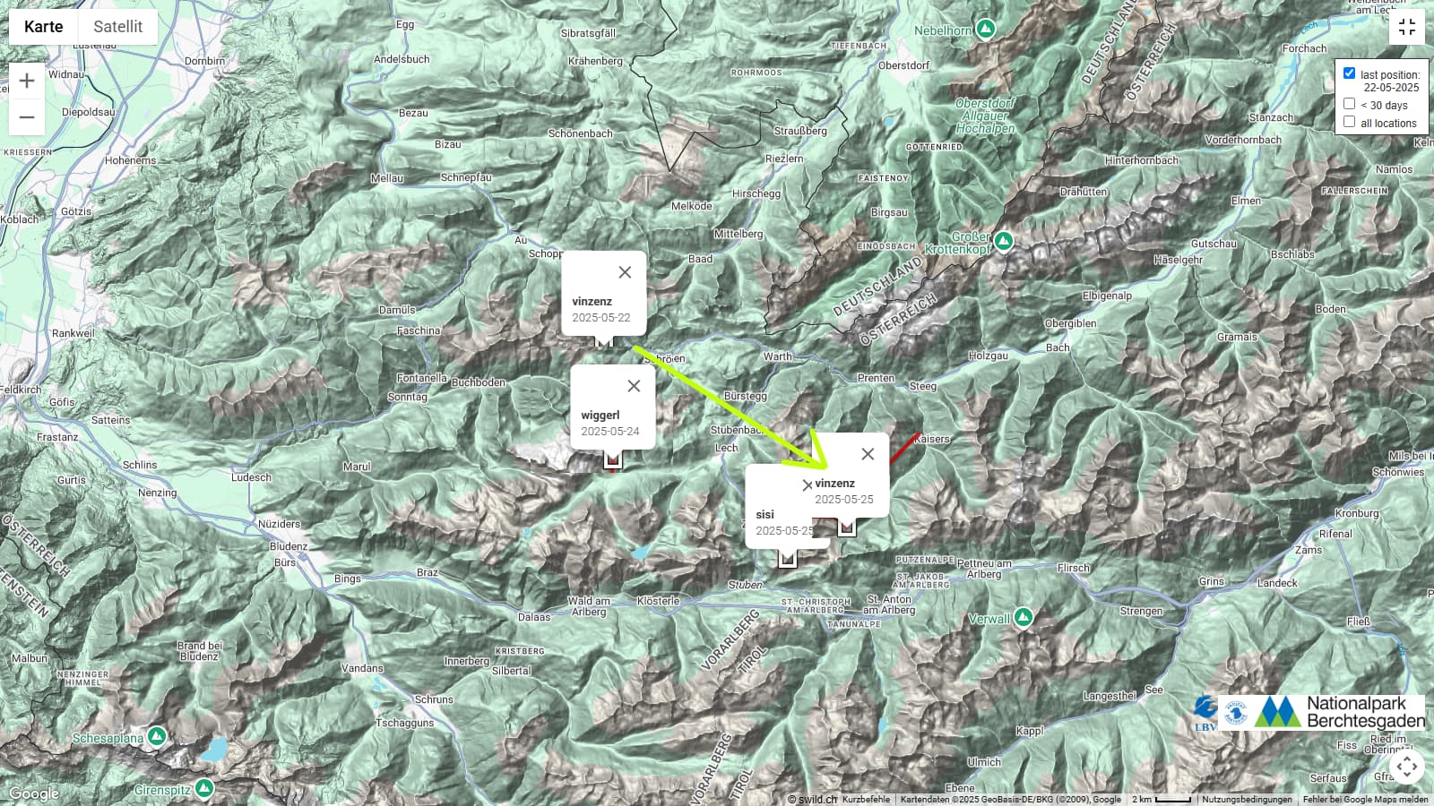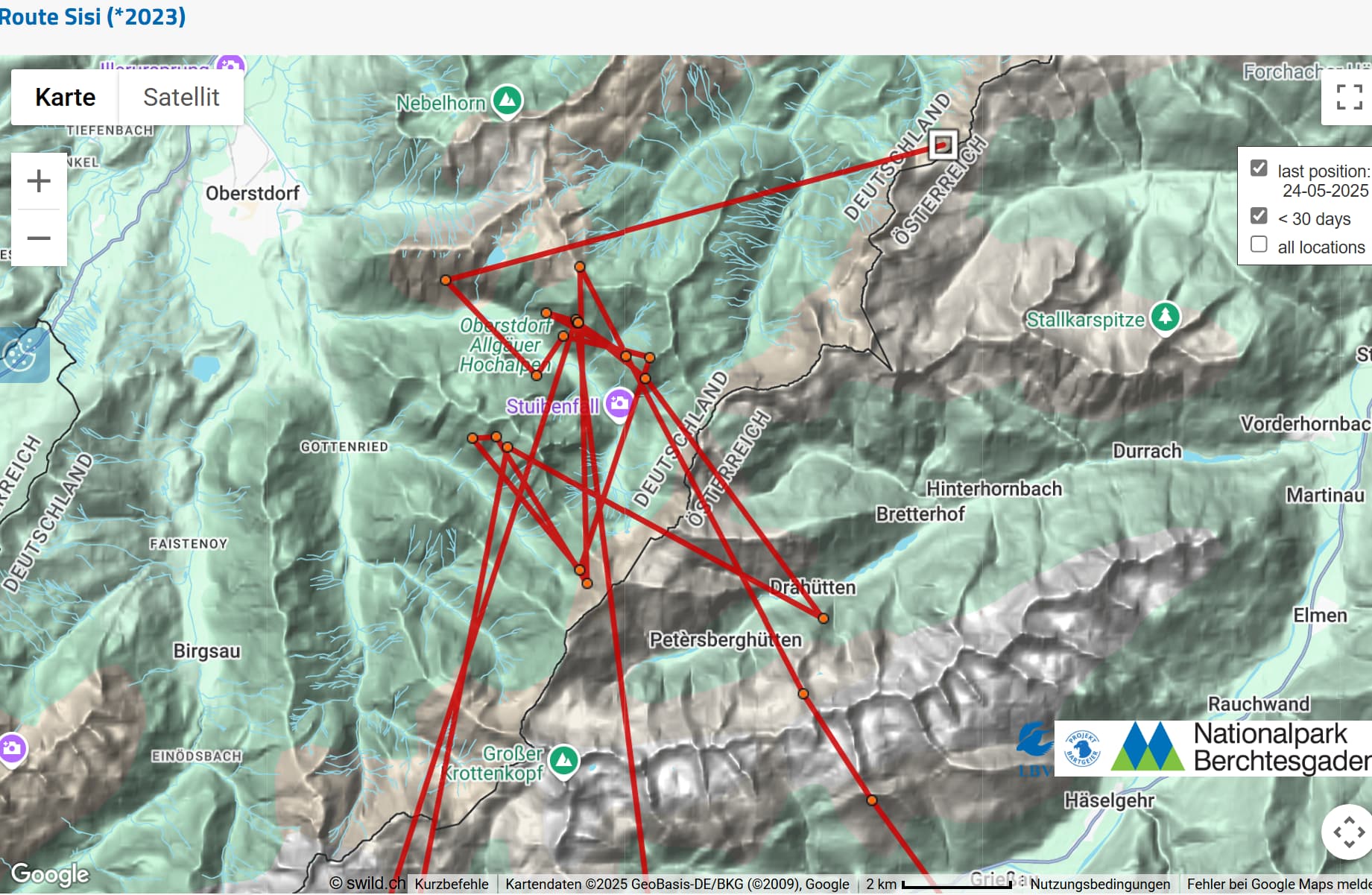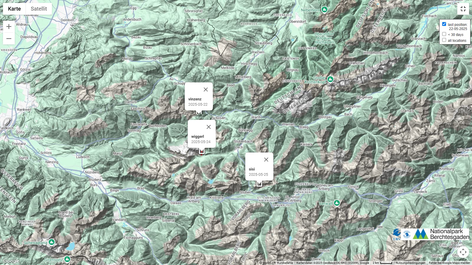 Der Wiggerl ist auch am 21.05. ungefähr da, wo er am 20. war und die Sisi ist ein etwas größeres Stück geflogen und wieder in den Allgäuer Alpen unterwegs.