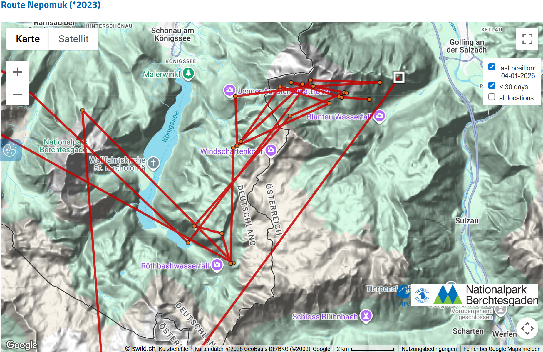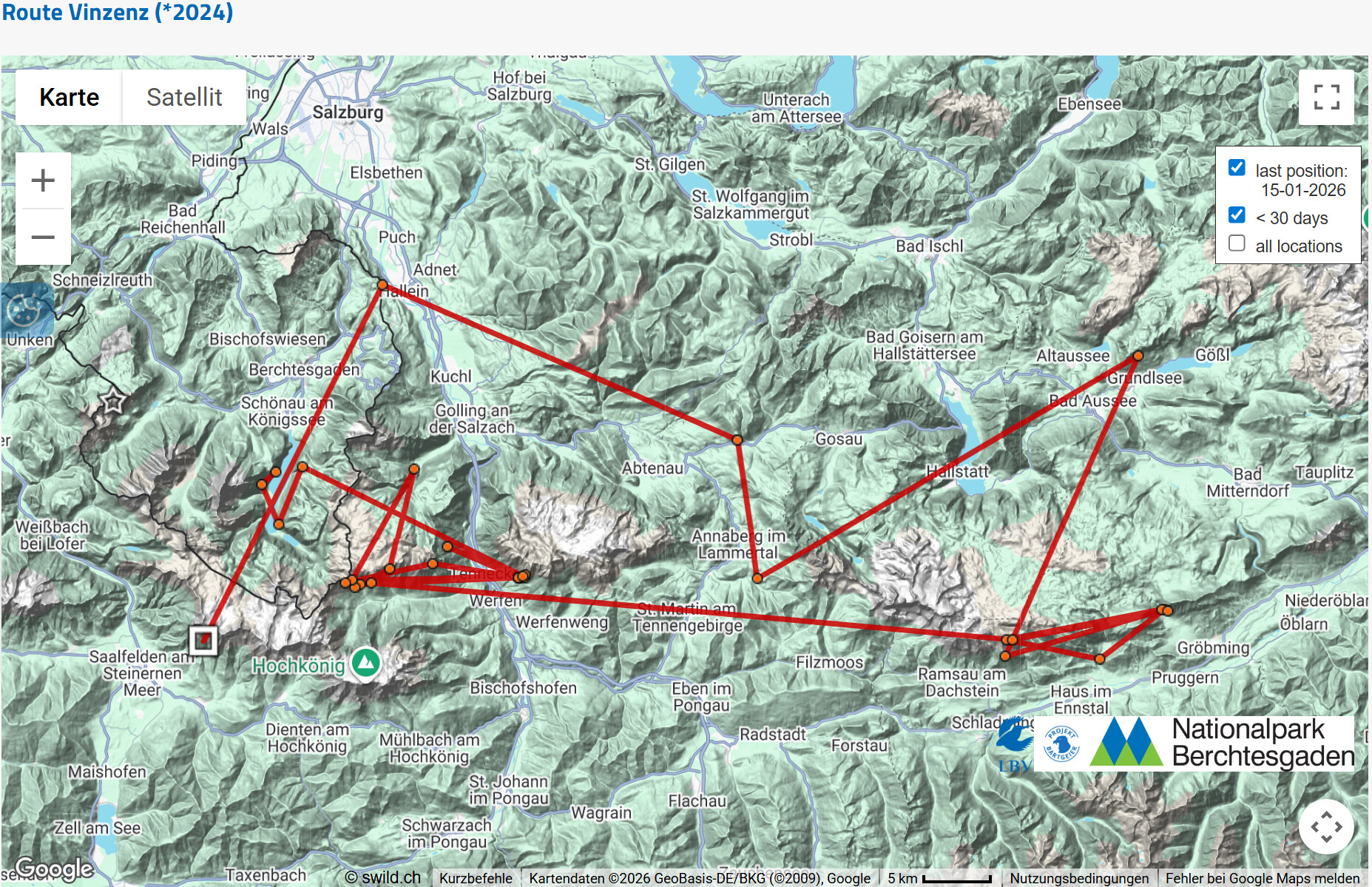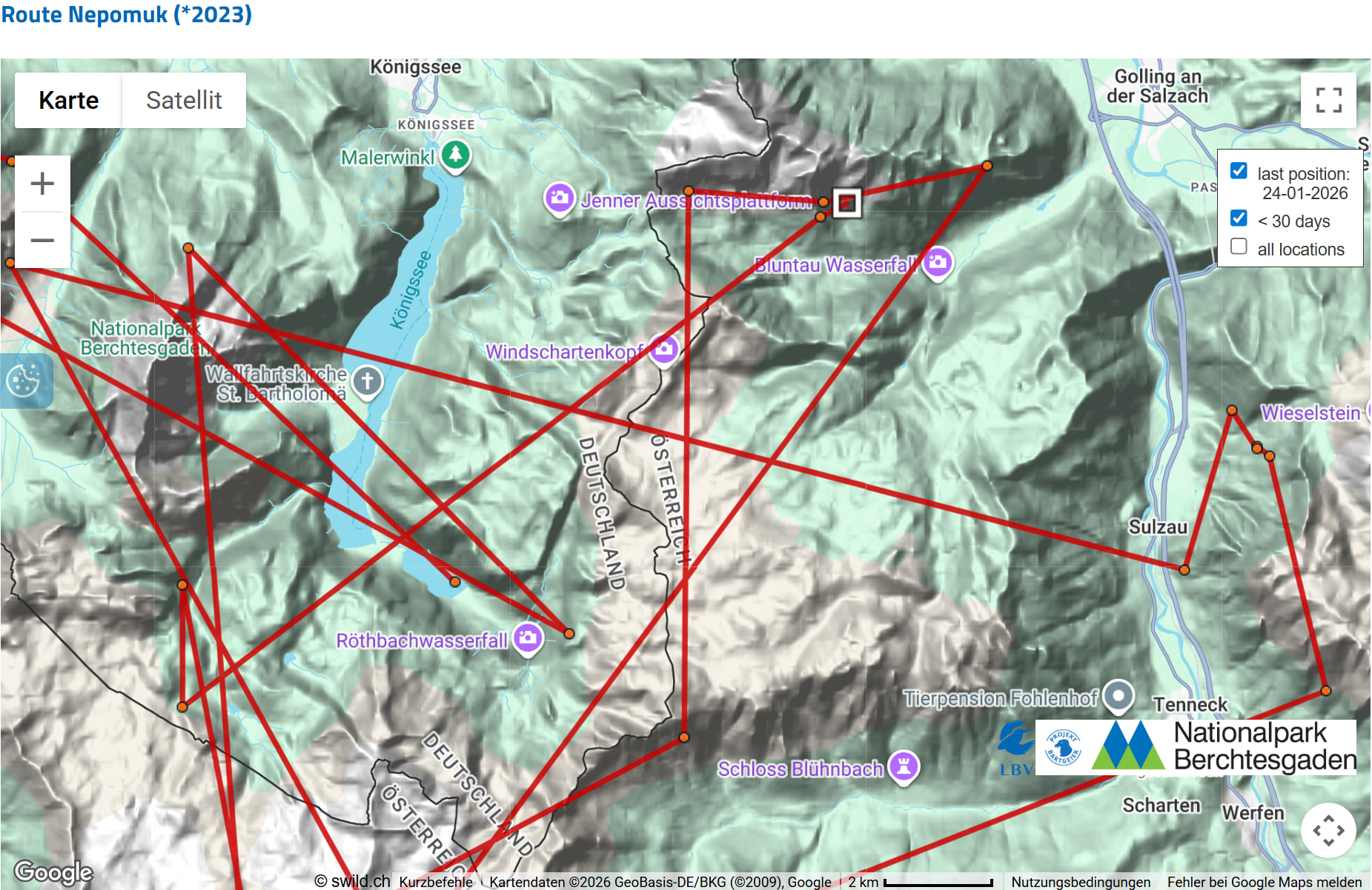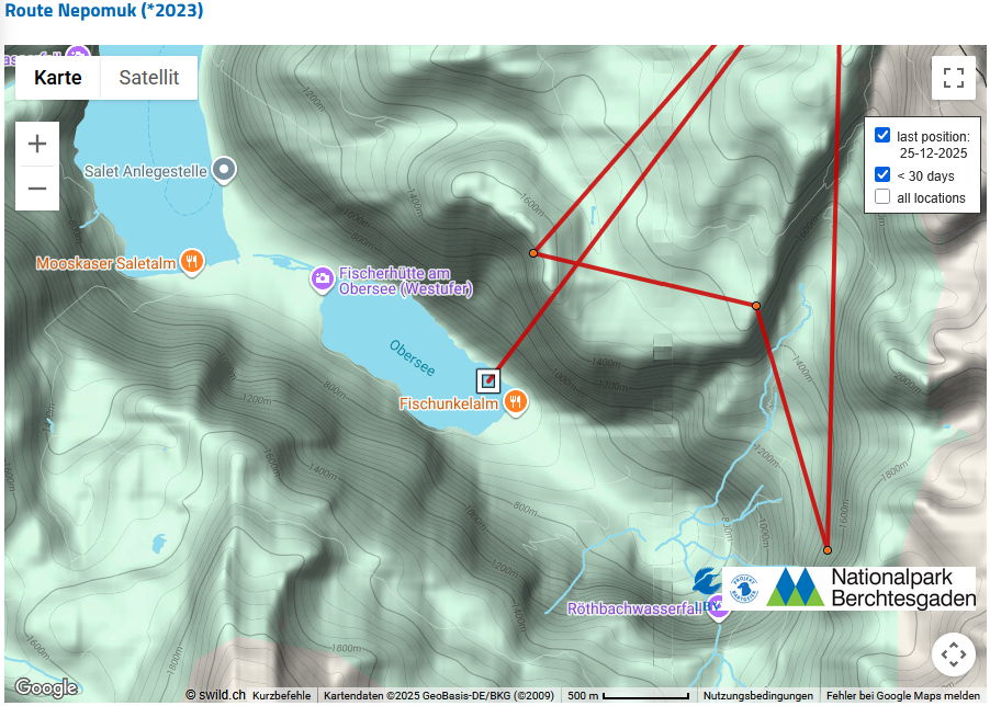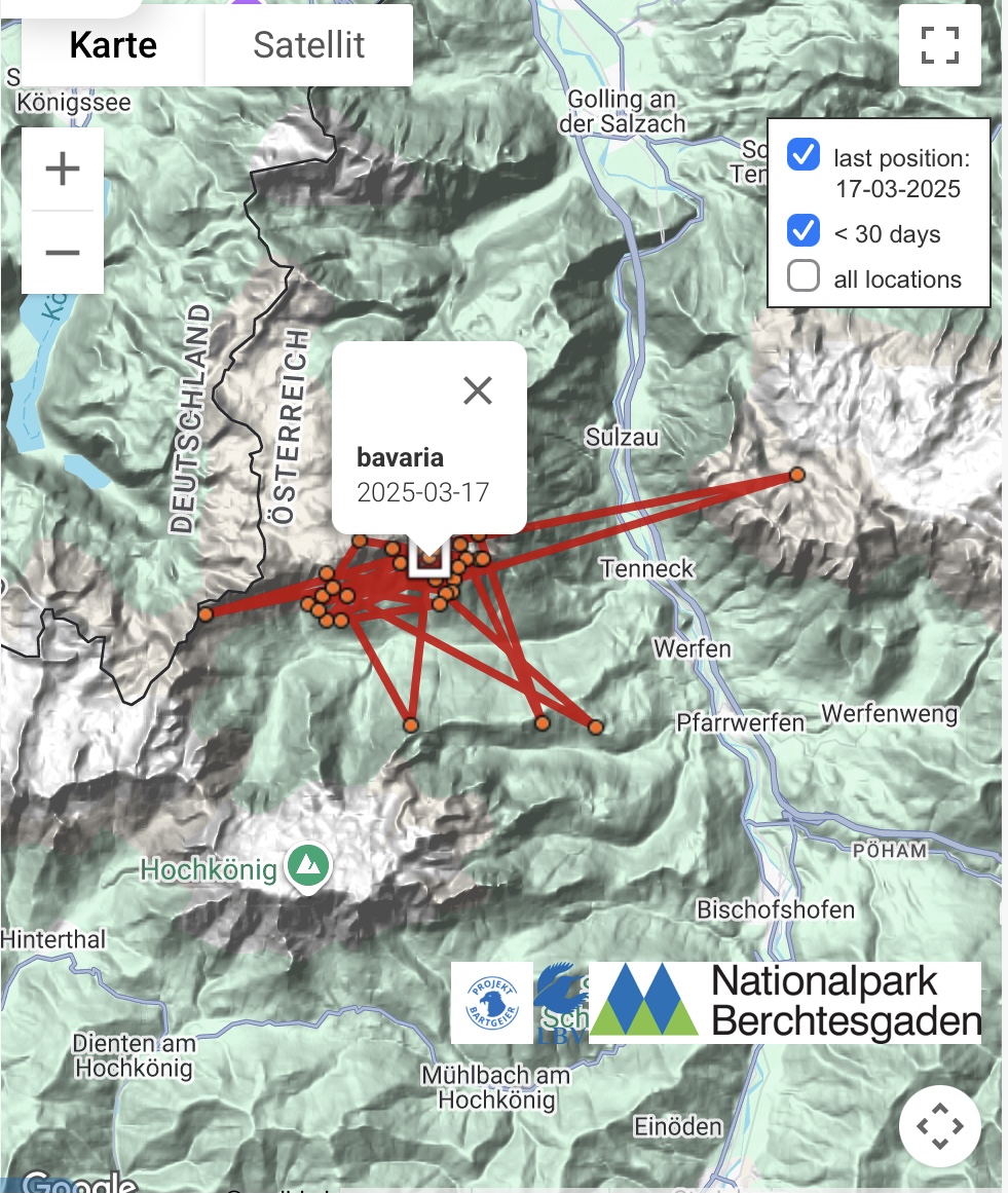 Das hat einen einfachen Hintergrund: Die Schweizer Kollegin, die das Interface betreibt, in dem die GPS-Daten der Bartgeier verwaltet werden, hat Bavaria aus der aktuellen Einsatzliste genommen. Das passiert mit allen Vögeln, bei denen der letzte Datenpunkt schon eine längere Zeit zurück liegt. Das hat einfach organisatorische Gründe, bessere Übersichtlichkeit, etc. Dadurch entfällt dann die dreitägige Latenzzeit zum Schutz der Vögel und der letzte Punkt wird dargestellt.