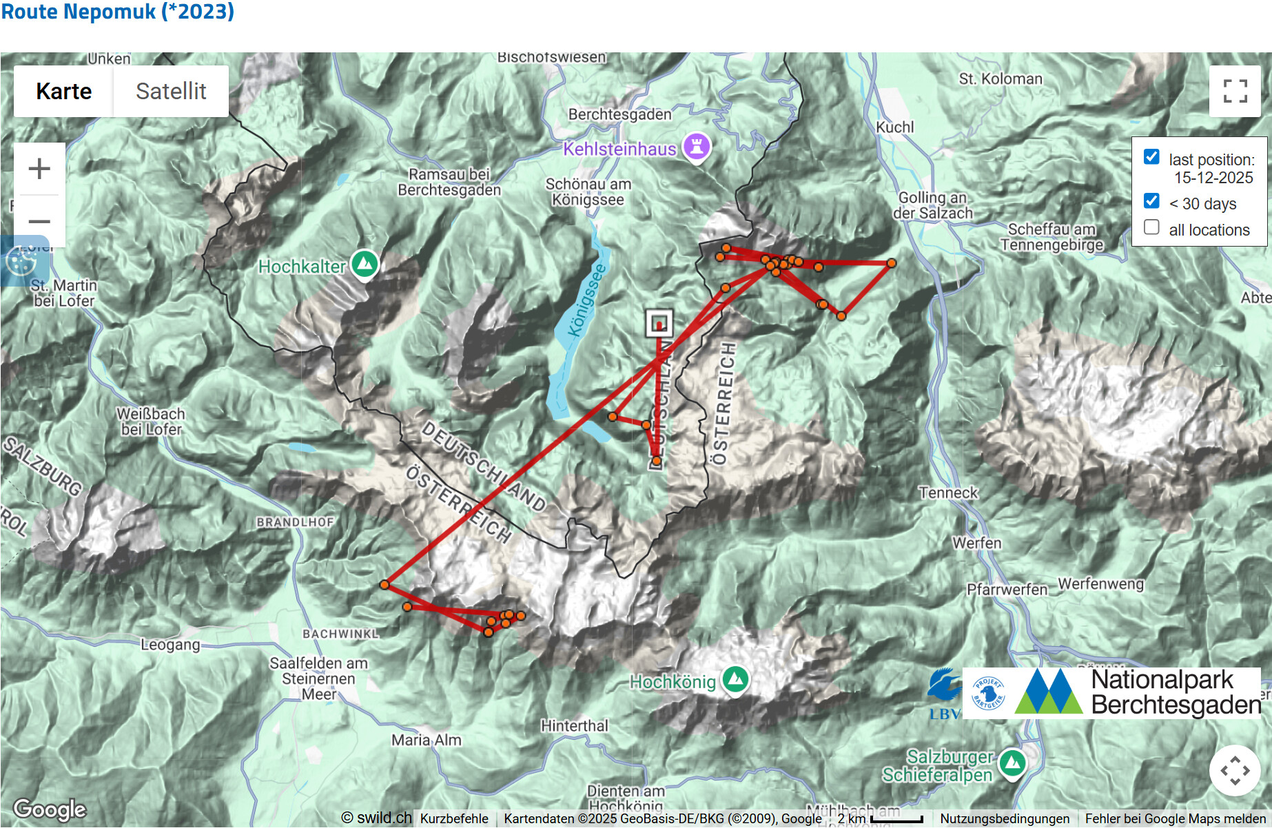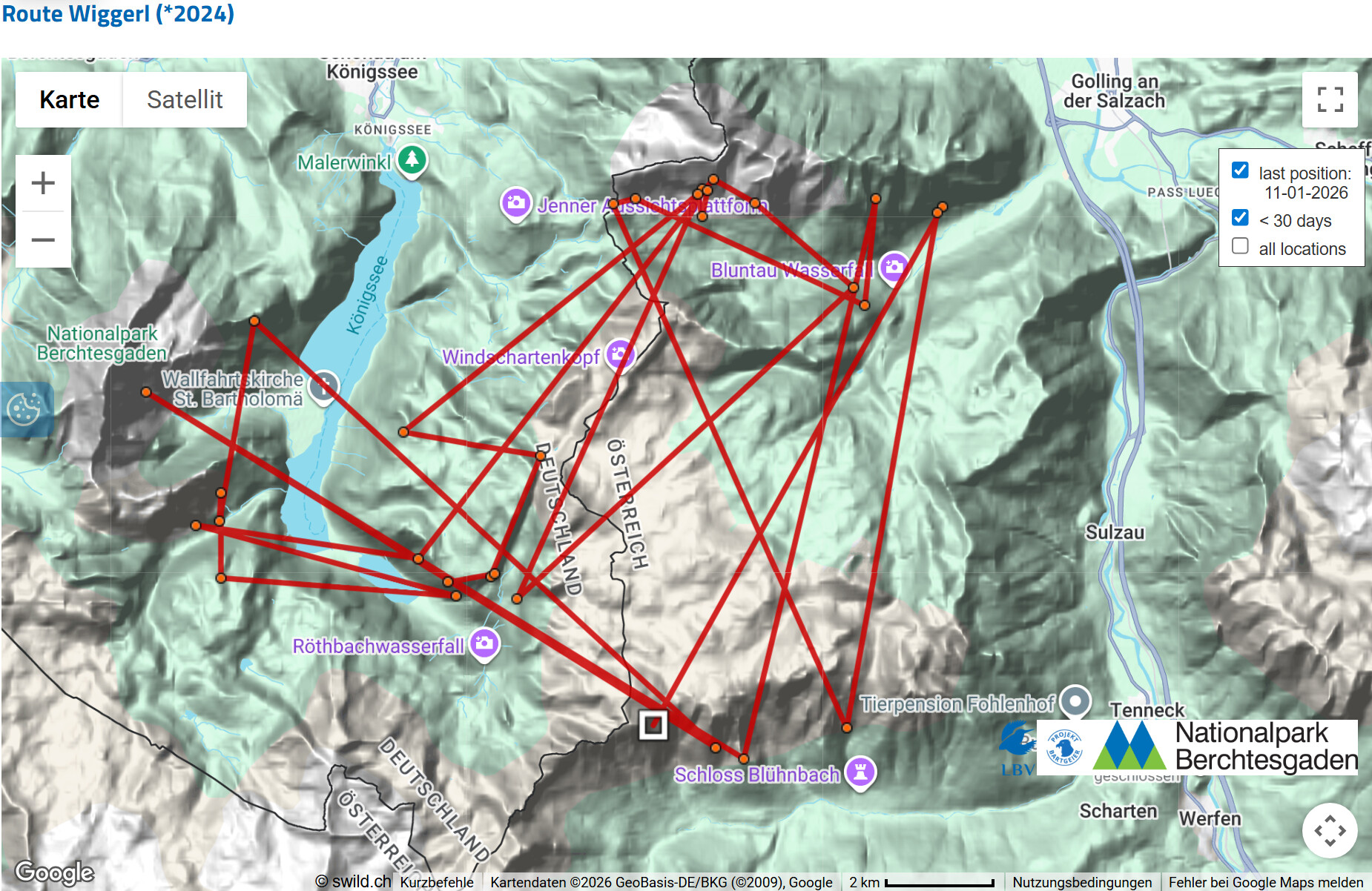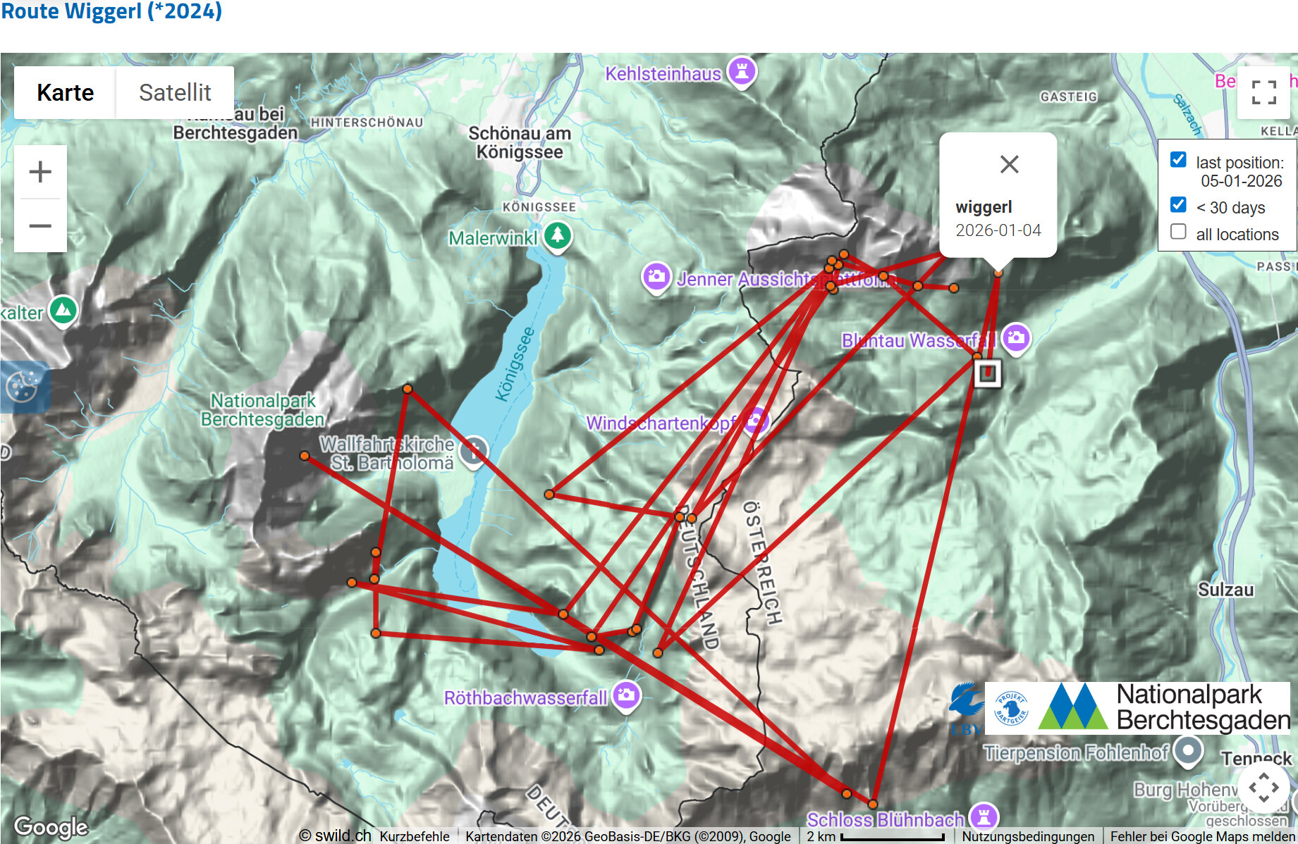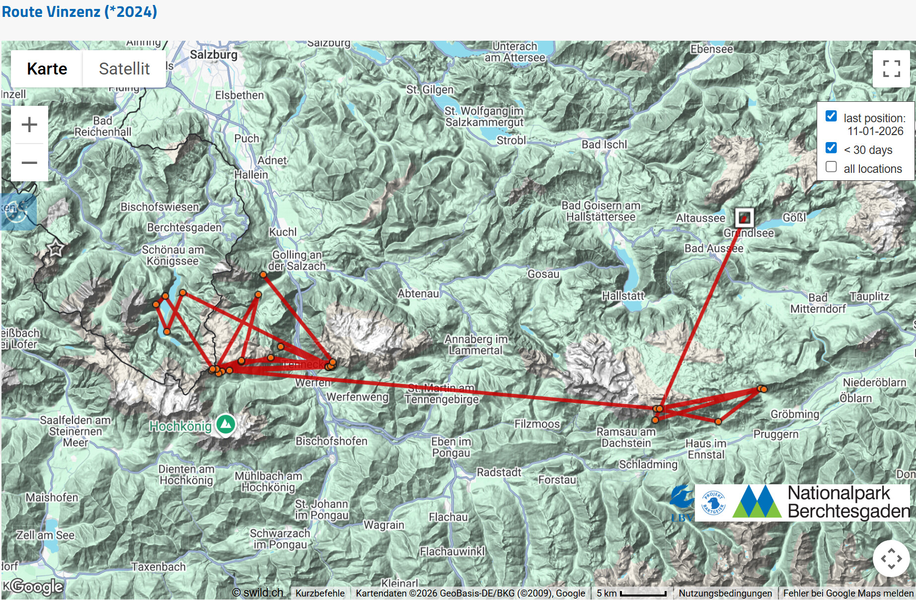 Das hat einen einfachen Hintergrund: Die Schweizer Kollegin, die das Interface betreibt, in dem die GPS-Daten der Bartgeier verwaltet werden, hat Bavaria aus der aktuellen Einsatzliste genommen. Das passiert mit allen Vögeln, bei denen der letzte Datenpunkt schon eine längere Zeit zurück liegt. Das hat einfach organisatorische Gründe, bessere Übersichtlichkeit, etc. Dadurch entfällt dann die dreitägige Latenzzeit zum Schutz der Vögel und der letzte Punkt wird dargestellt.
