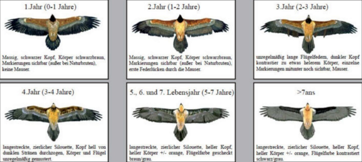 Während Bartgeier in den ersten Lebensjahren eine recht dunkle Gefiederfärbung aufweisen, bilden sie mit zunehmendem Alter ein kontrastreiches Gefieder aus, wobei vor allem das orangefarbene Rumpfgefieder hervorsticht.
