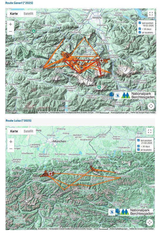 Vor einem Jahr sind Generl und Luisa geschlüpft - hier mal ihre bisher geflogenen Strecken. Ihren „Schlüpftag“ werden sie wohl nicht gemeinsam feiern ![]()