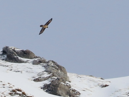 Am Freitag sind wir mit den Schneeschuhen zur Pointhütte im Bärgündeletal bei Hinterstein gewandert. Über den Bergspitzen beim Prinz Luitpold Haus sahen wir drei Greifvögel kreisen. Wir vermuten, es waren zwei Bartgeier und ein Steinadler. Sie waren leider sehr hoch.