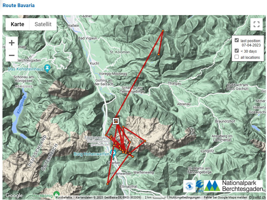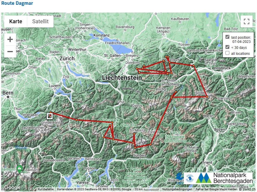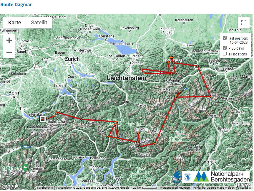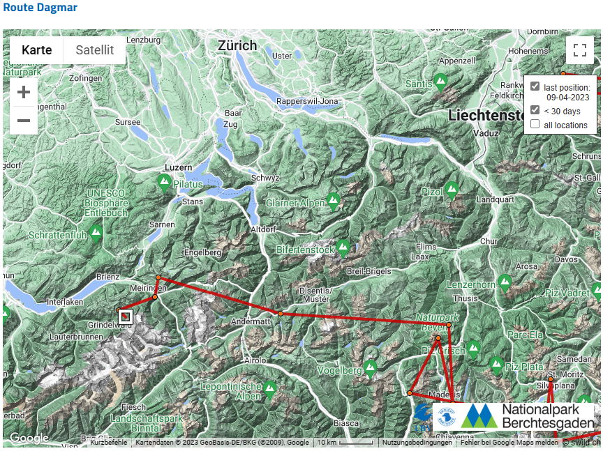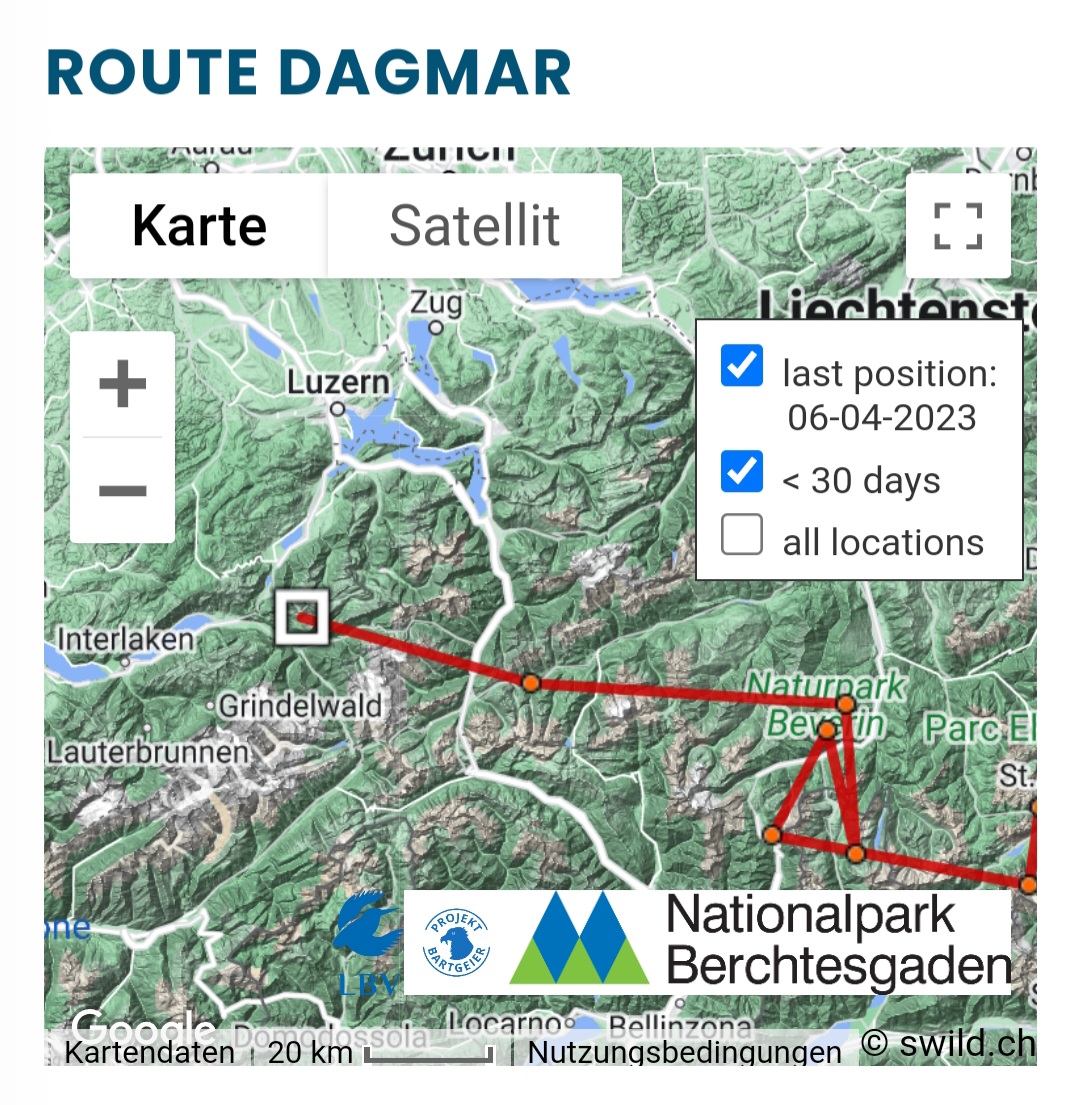 Bei Dagmar bin ich jetzt mal gespannt. Ich hatte ja vor einigen Tagen drauf getippt, dass sie Richtung Eiger fliegen wird und jetzt stimmt die Richtung schonmal mit Grindelwald. ![]()
