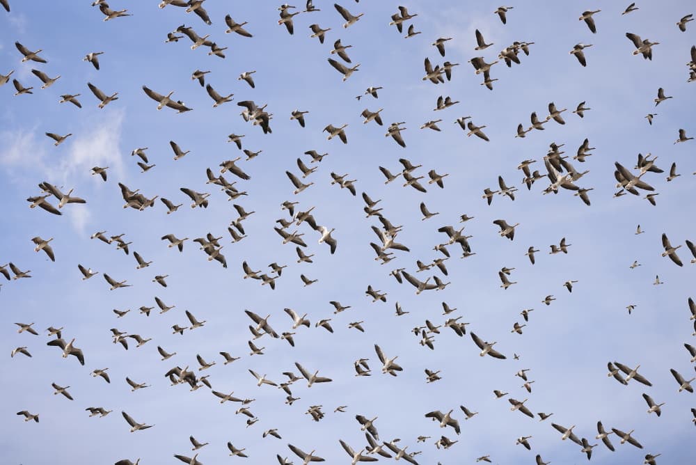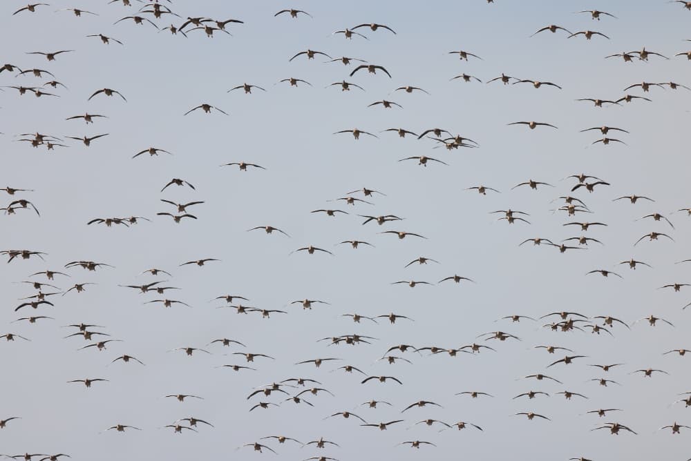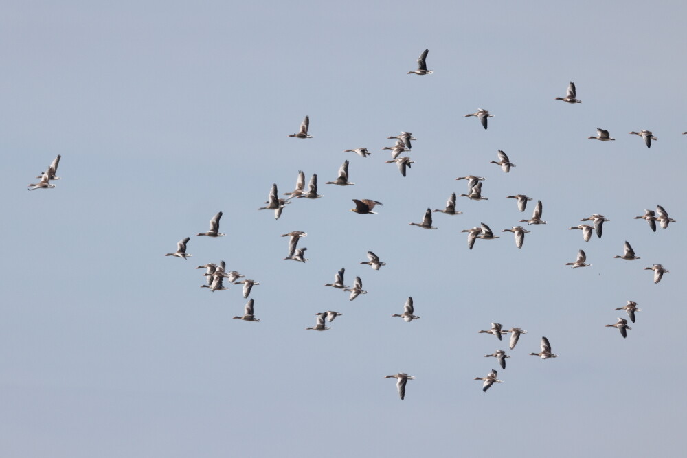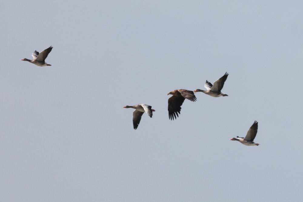 Ein paar Graugänse und mitten drin ein Seeadler.