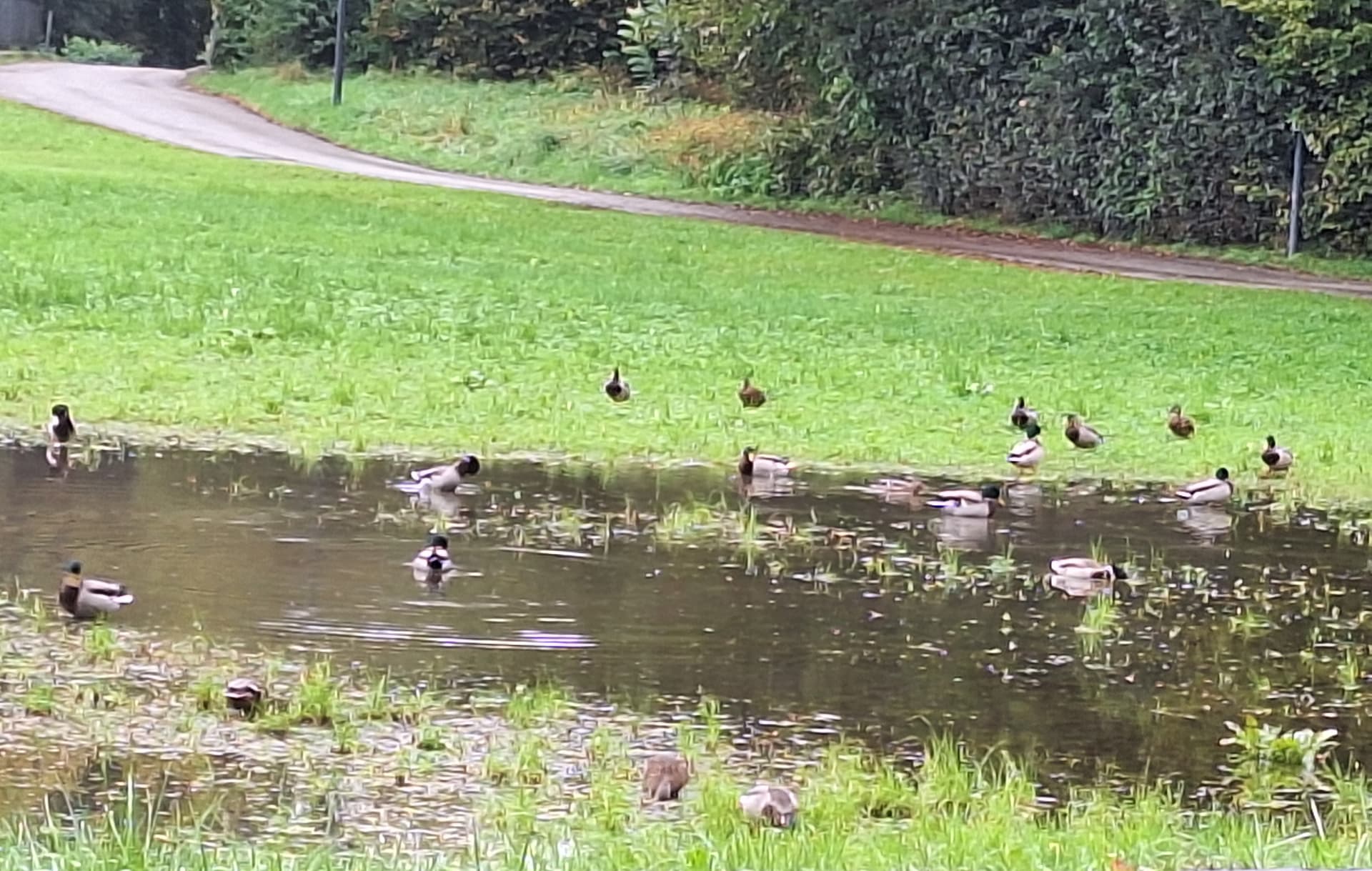 Die berührende Szene, die ich gerade am Weg zur Arbeit sehen durfte, mag ich gerne hier teilen. Etwa 30-40 Enten in einer großen Wasserlacke auf einer Wiese (ist am Foto nur ein Ausschnitt)… man kann aus jeder Situation das Beste machen. Rührend.
