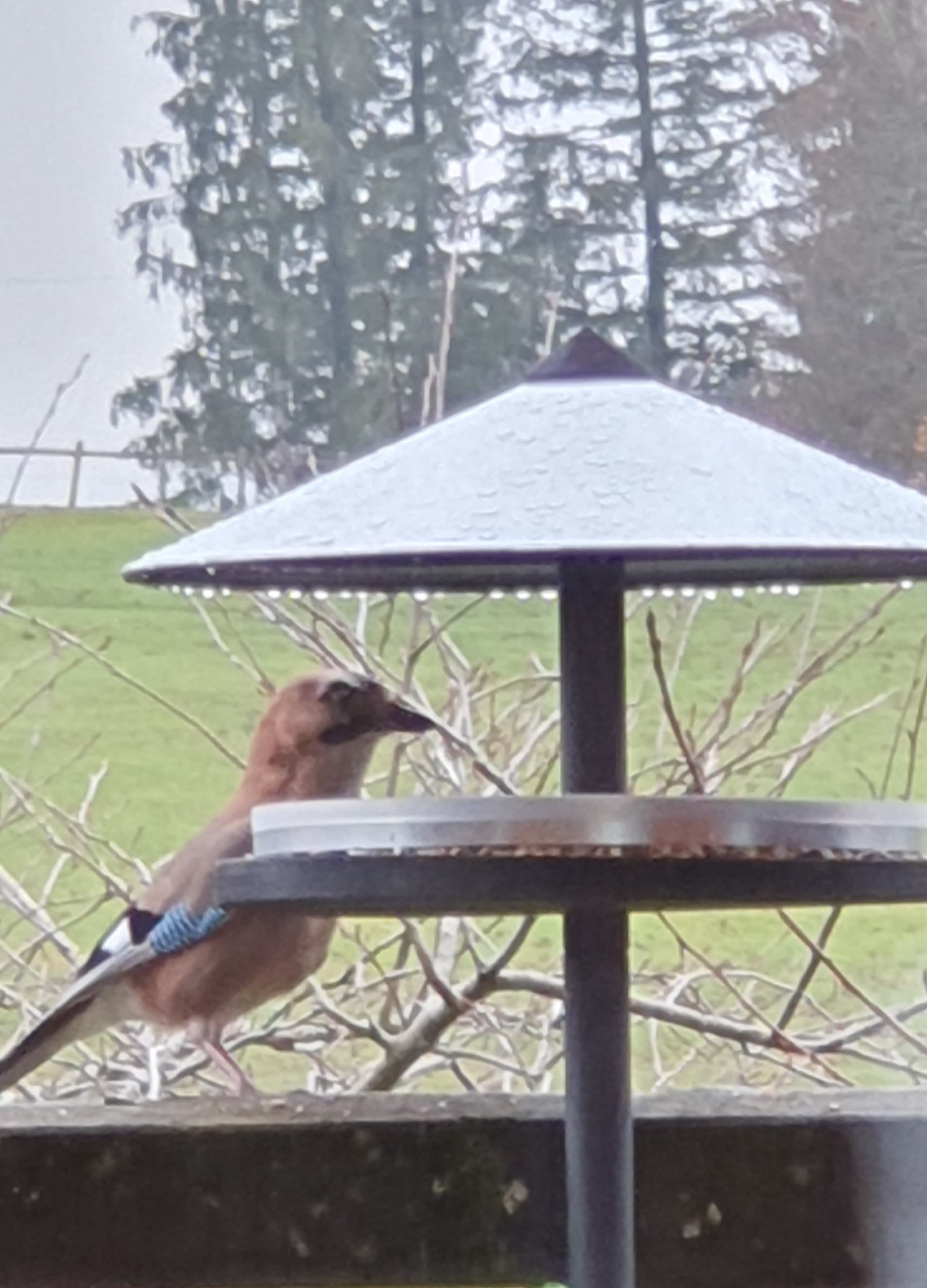 Heute ist es mal trüb, neblig und regnerisch. Dafür gab es gerade Besuch von drei Eichelhähern im Wechsel