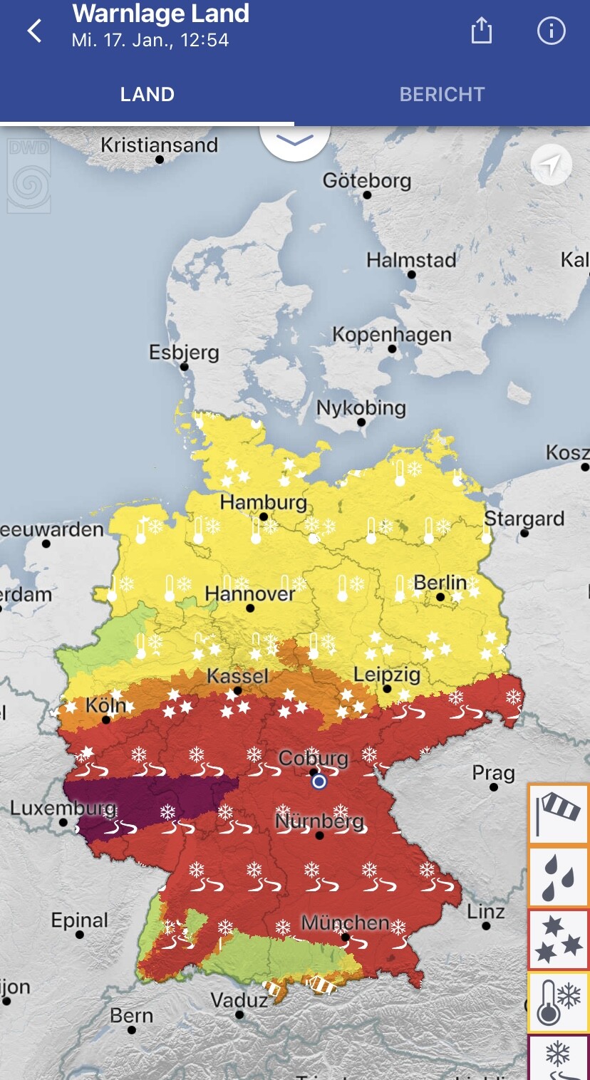 Hallo Dorie! Auf der Wetterkarte ist doch so ein tiefroter Keil. Dort, wo das zweite Kristallchen von links ist, da wohne ich! Wenn wir Glück haben, können wir zwischen 17 und 18 Uhr mit dem Auto zu einem rutschfreien Platz fahren und etwas Gassi gehen. Heute morgen haben wir es noch vor Einsetzen des Eisregens zu einer Runde geschafft. Mehr geht heute nicht!