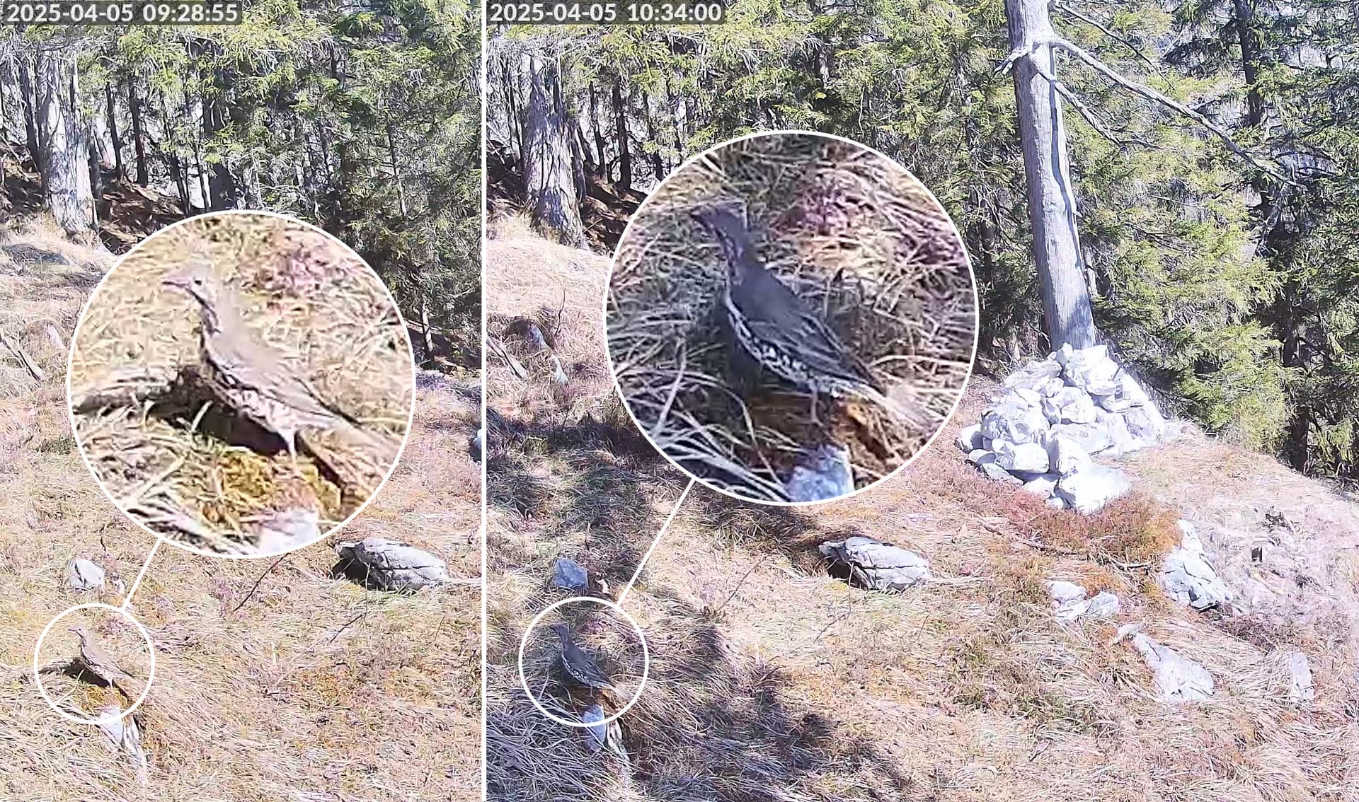 Der kleine Vogel ist auf dem Screenshot kaum zu erkennen (Schnabel links, Schwanz rechts). Im Videostream hat er dagegen sehr auf sich aufmerksam gemacht: Er pickte und zerrte fast zehn Minuten an dem Rest des Kadavers herum.