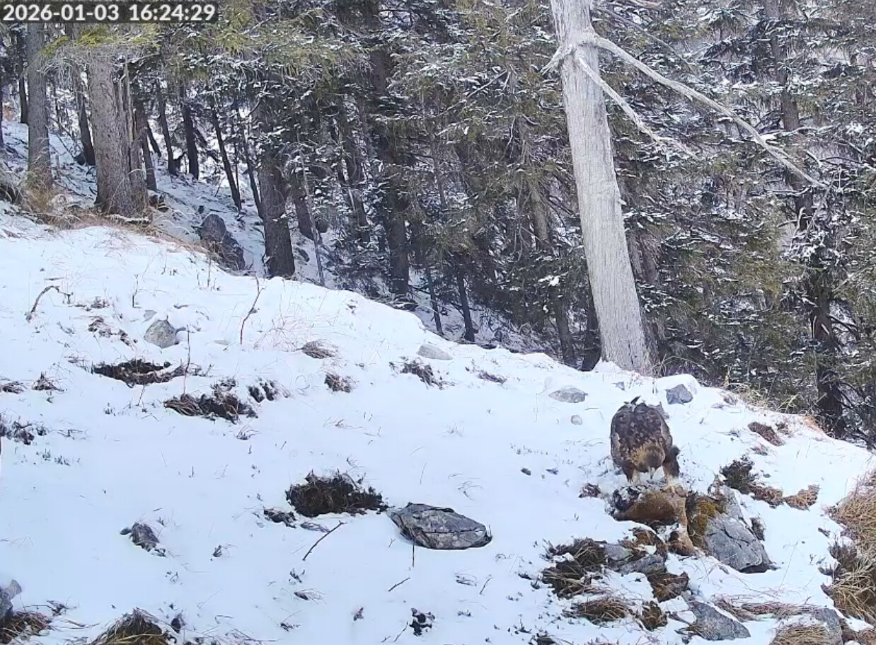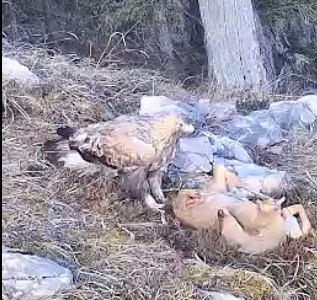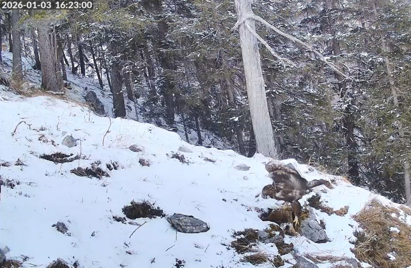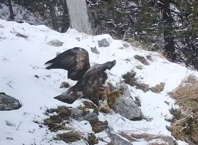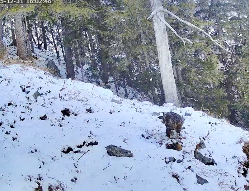 Der Schnee ist zum Teil weggetaut und man sieht gut, dass sich die Steinadler bisher überwiegend an der hinteren Hälfte des Kadavers versorgt haben.
