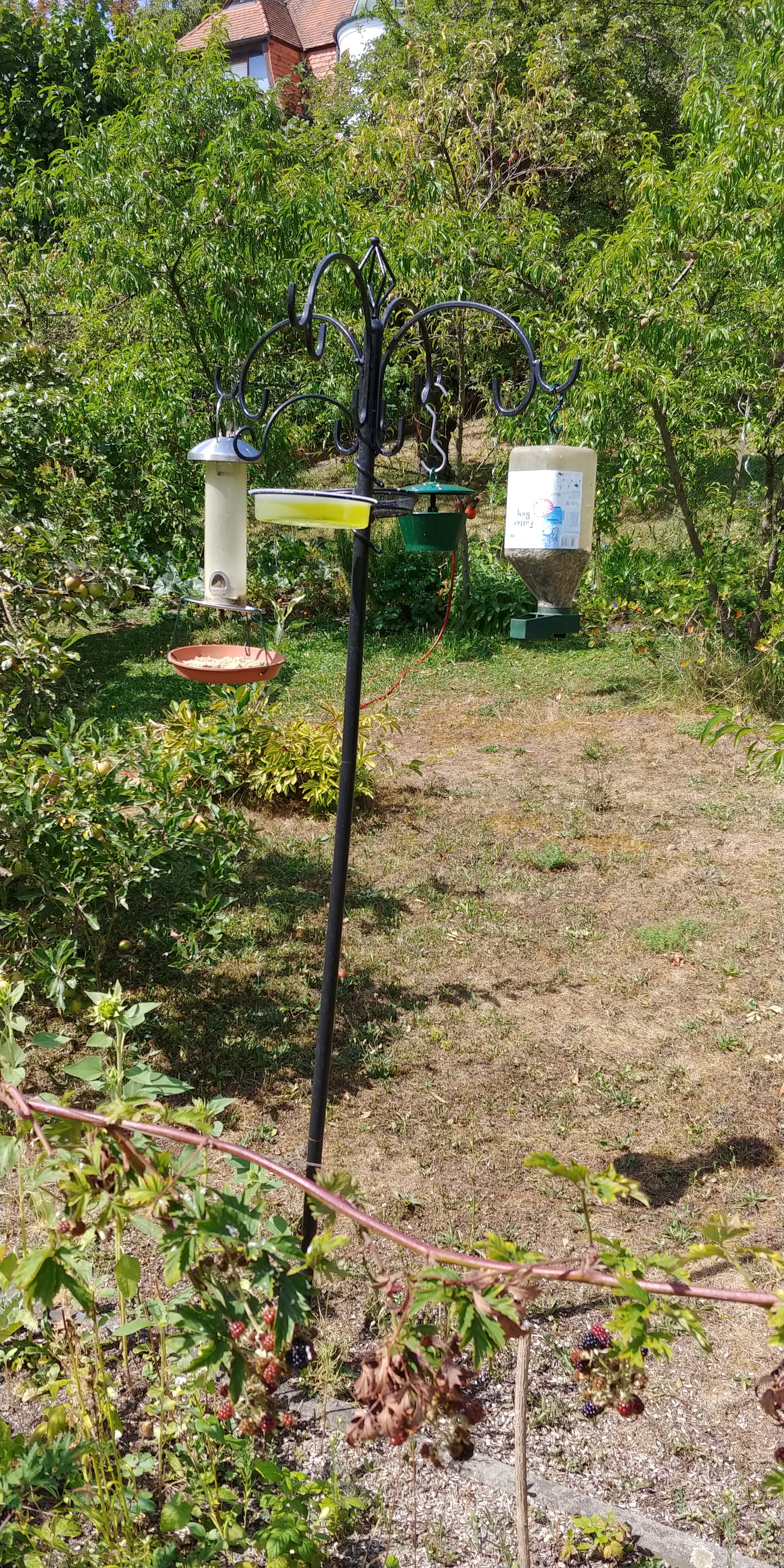 Zum Thema Futterstange hab ich auch noch was. Ich hab mir die ganz Grosse von V…a bestellt mit den 4 ausladenden Haken oben. Sie wird gut von den Vögeln angenommen. Nachteil das Zusatzfüsschen unten an der Stange, das zum Reintreten gedacht ist und Stabilität bringen soll, war so windig angeschweisst, dass es beim Reintreten in die Erde gleich abgebrochen ist. Habs ohne das Teil reingeklopft und sie steht immer noch. Allerdings neigt sich das Ganze langsam zur Seite, weil wenn Specht oder Eichelhäher landet das ganze etwas wackelt. Wir haben schon Bodenanker besorgt und wollen sie abspannen.