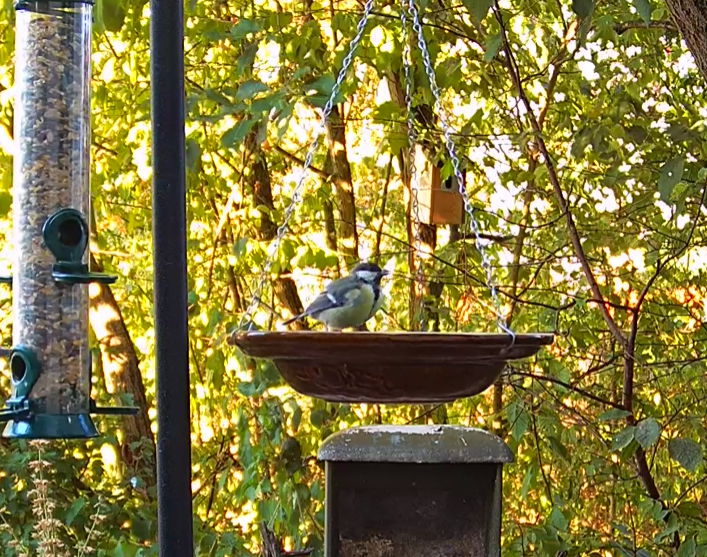 13:29 - Blaui hatte Durst, hat mehrfach getrunken, und ich hab sie dann genau im Abflug erwischt. Die Spatzen bei Petra sind nach und nach von oben ins Bild „getröpfelt“ ![]()