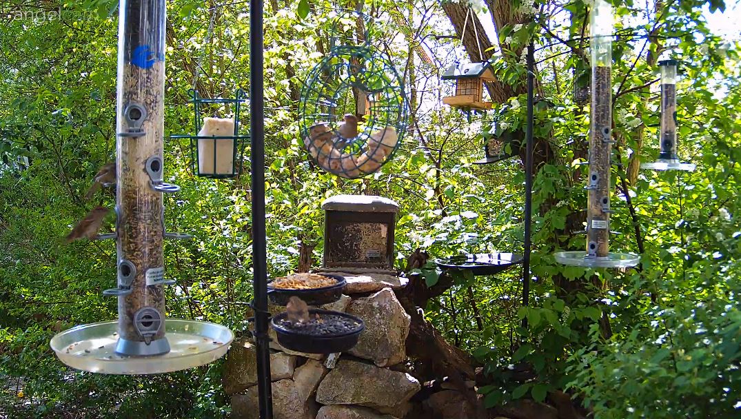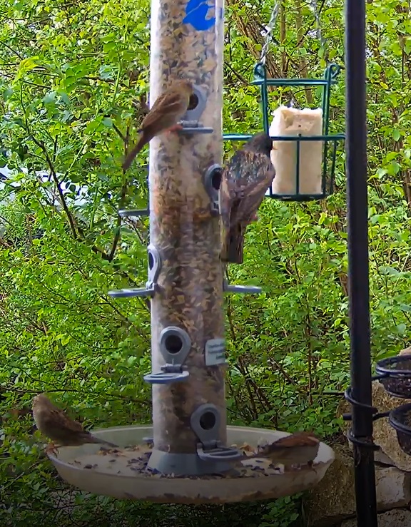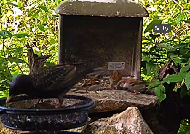 Viel Besuch bei Sonnenschein. Der Star lässt sich von den Spatzen nicht stören.