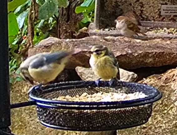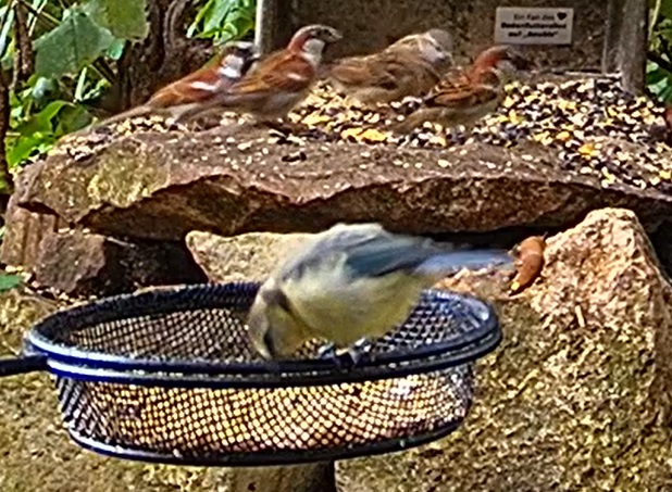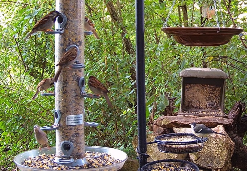 Seit die Futterbehälter aufgefüllt wurden herrscht großer Andrang von Spatzen und Meisen.