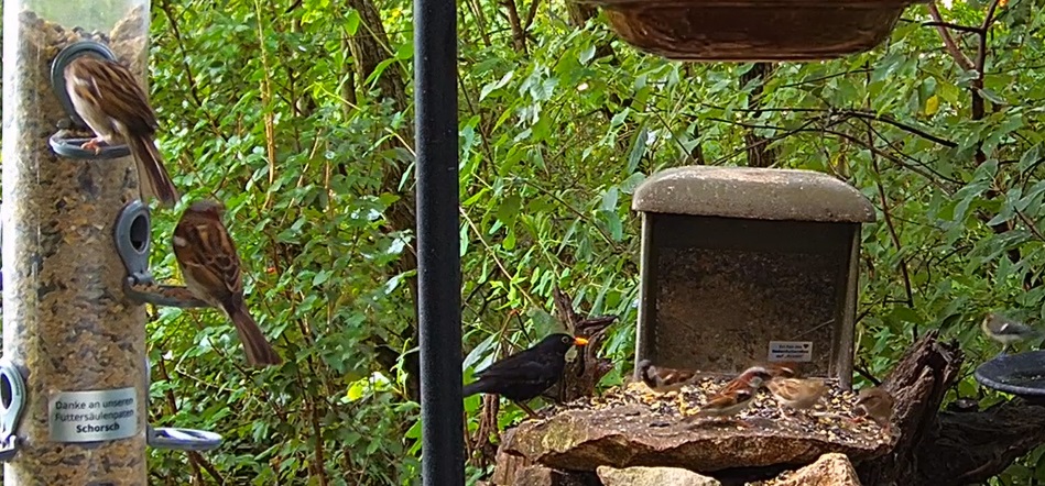 Sonntagsgesellschaft, viele Spatzen mit Blaumeise, Amselmann und Tüta