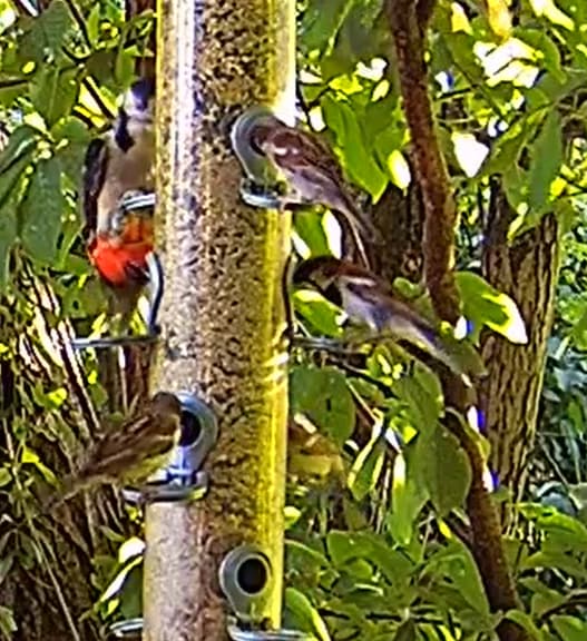 Zusammen mit den Spatzen hat sich der Specht bei „Petra“ den Bauch vollgeschlagen.