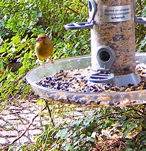 Der Appetit hat ihn an den Futterplatz gelockt, einmal zu „Schorsch“ und dann noch bei „Petra“ vorbeigeschaut. Verwöhnter Grünfink. ![]()