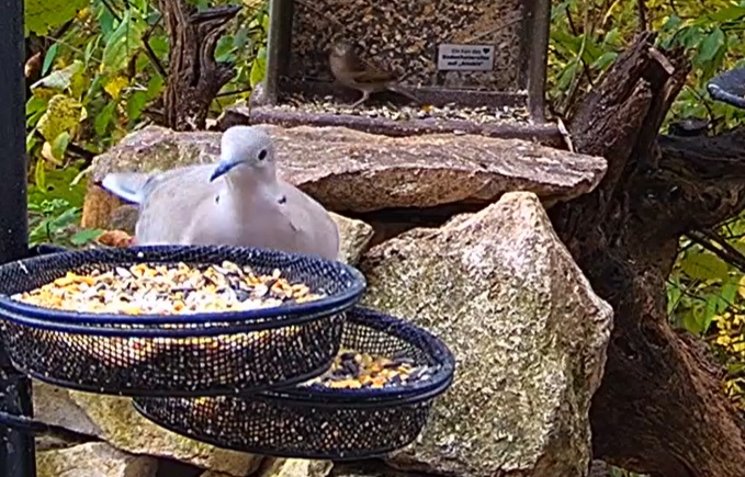 Türkentaube lässt die Körner fliegen.