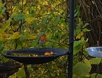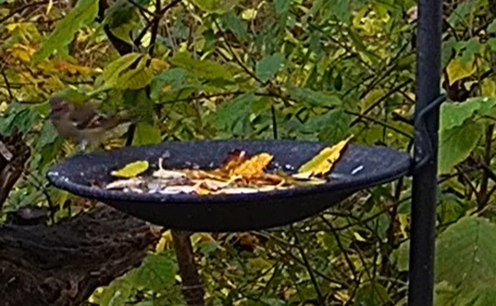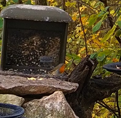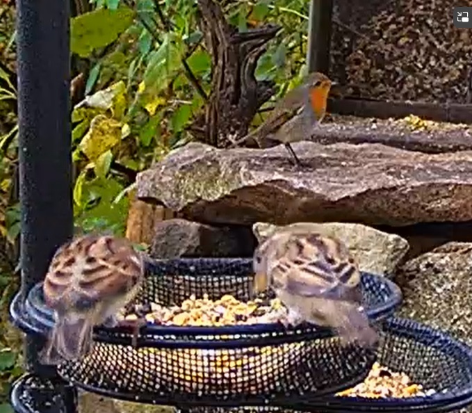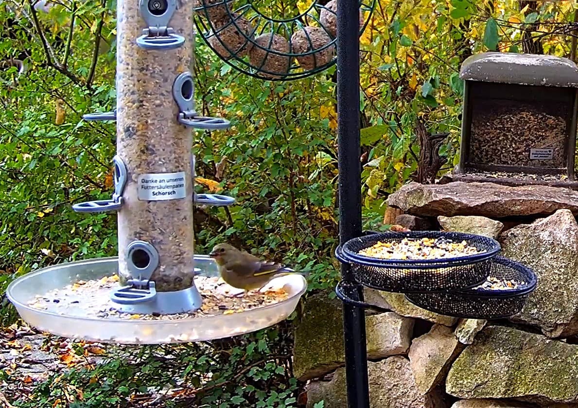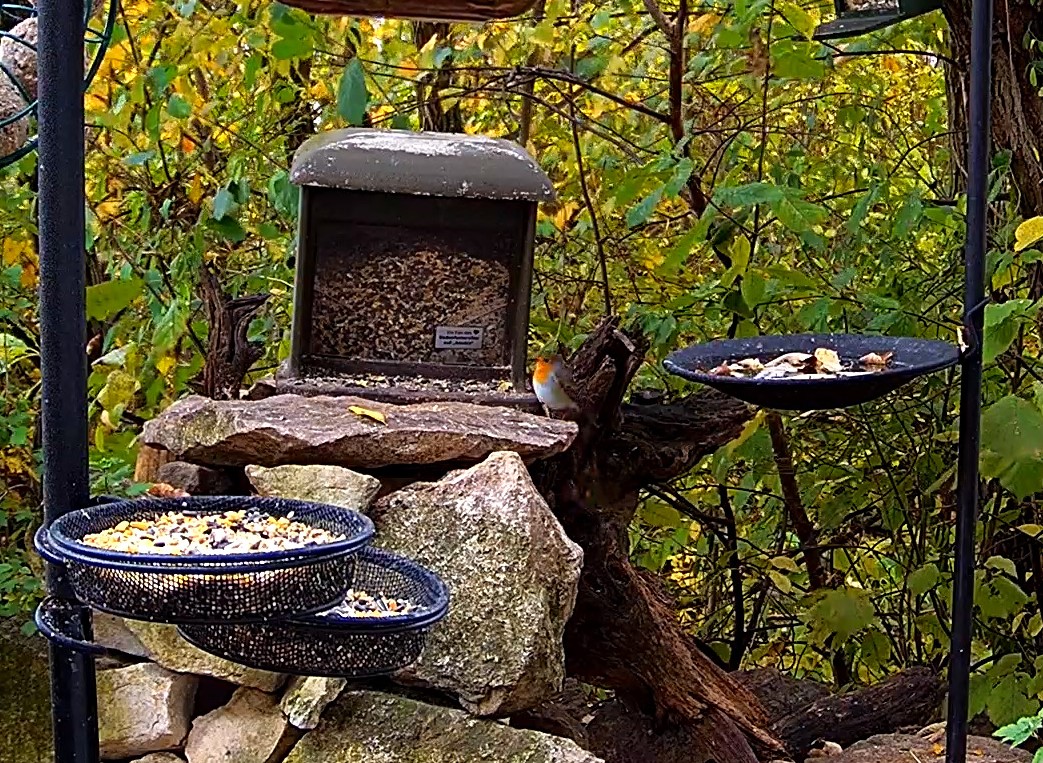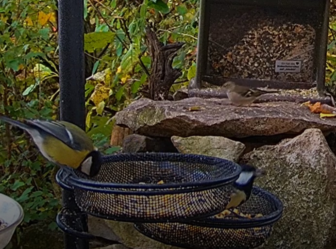 Die Futterstelle gut besucht von Meisen und Spatzen. Aber auch gern zum Frühstück da sind Robin, Elster und Buchfinkweibchen. (War heute leider sehr schnell wieder weg.)