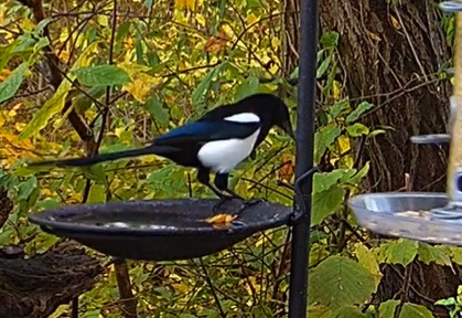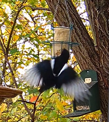 Elster holt sich ein großes Fettstück und Kleiber vorne am Körbchen