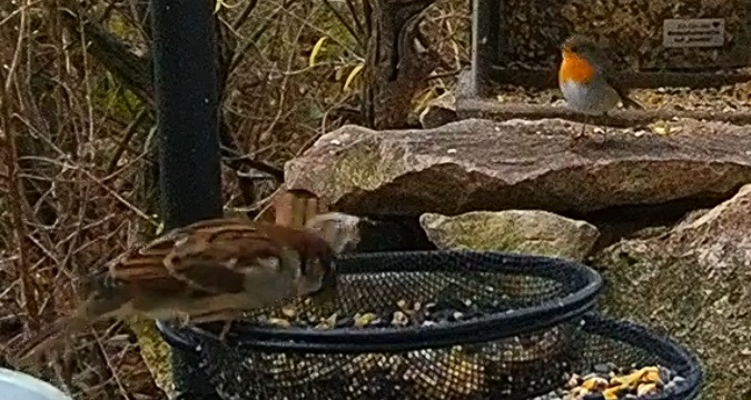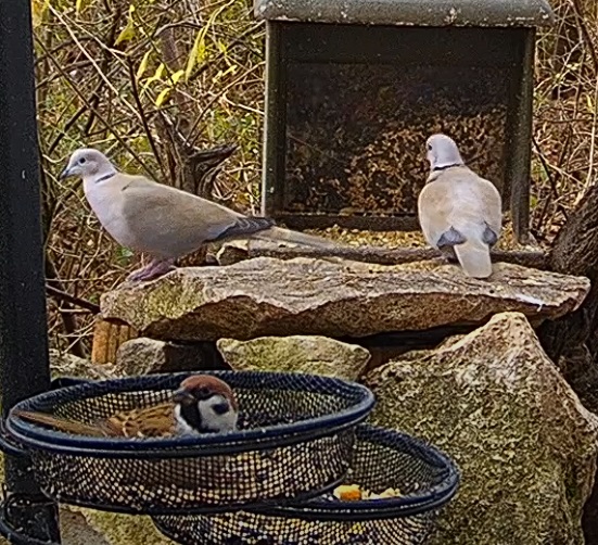 Amsel, Robin und Spatz zusammen als Frühaufsteher am Futterhaus. Robin hält sich morgens weiterhin gerne dort auf. Heute war noch ein Türkentaubenpaar auf Kurzbesuch.