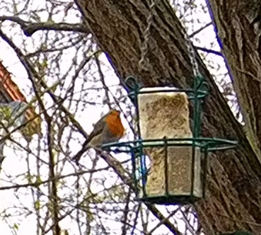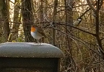 Robin der Frühaufsteher beobachtet eine Kohlmeise am Liter. Später ist er selber auf den Geschmack gekommen. ![]()