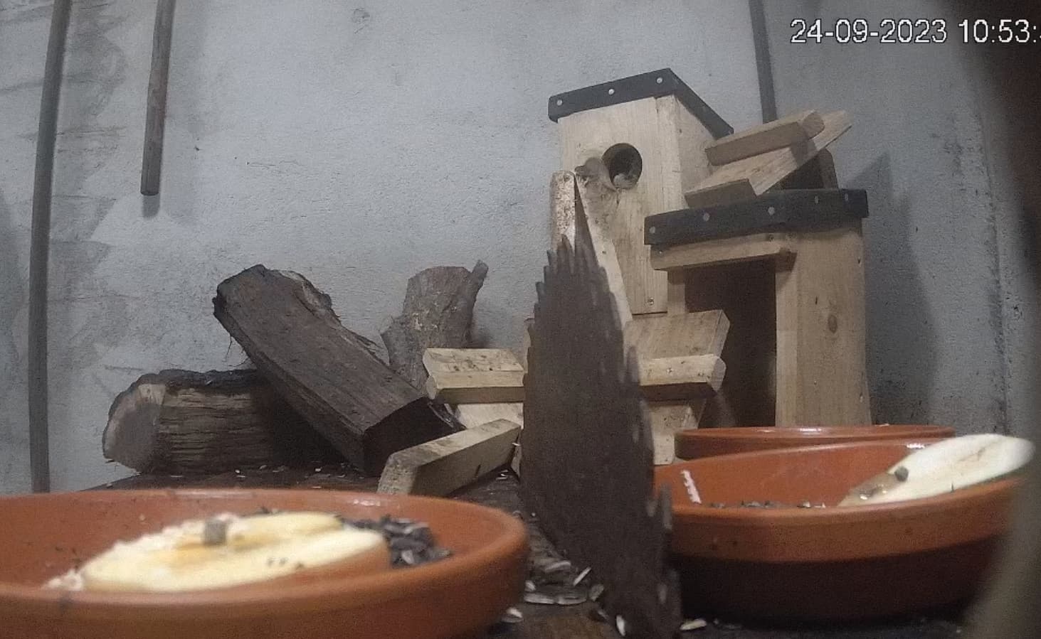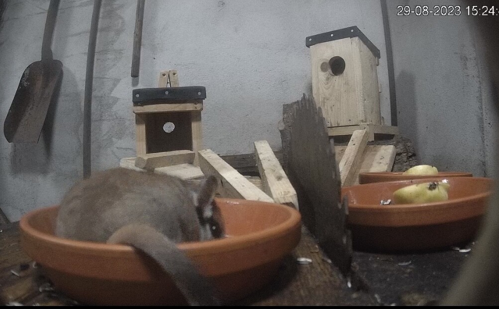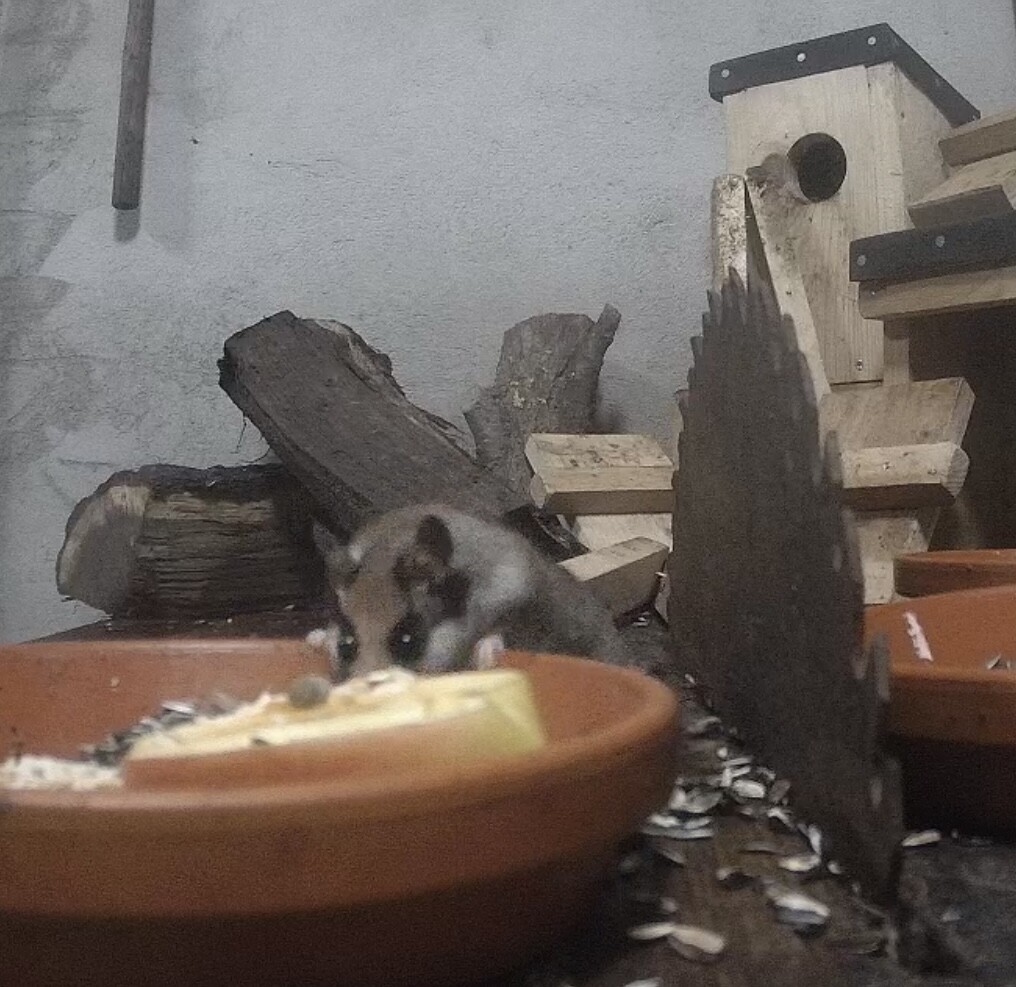 Vorhin war ein ganz vorsichtiger Kobold am Fressen und war danach wieder hinter dem Holz verschwunden.