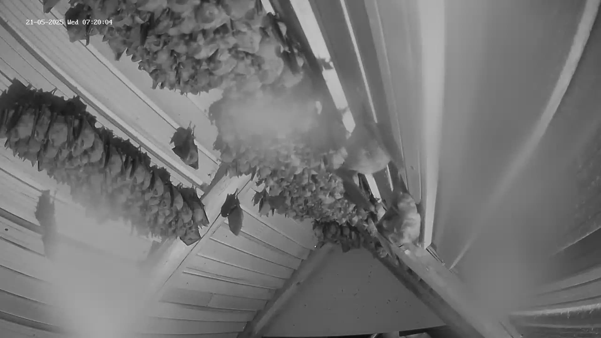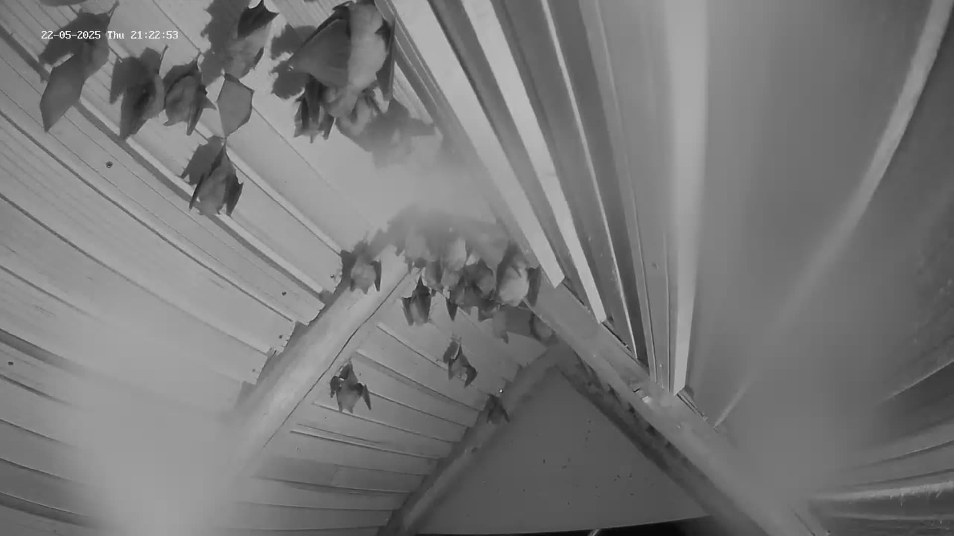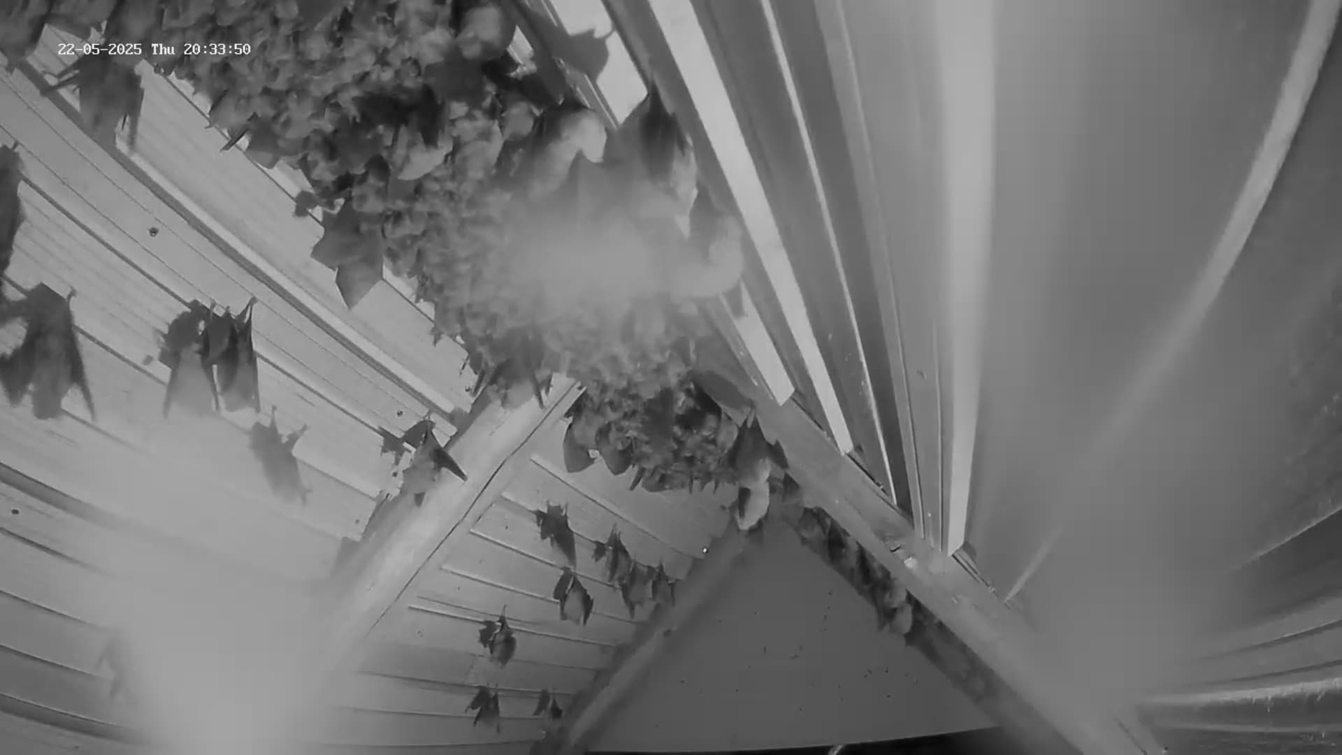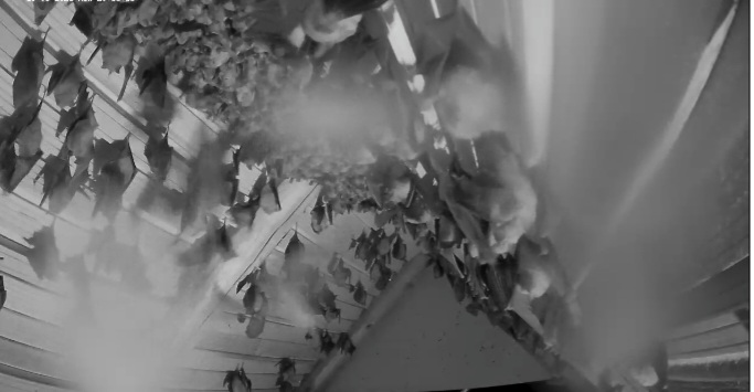 Hallo Zusammen, schön dass wir mal wieder neue ZuschauerInnen haben! Jetzt grad um 23:30 Uhr sind schon einige (vielleicht etwa 100) Hufis vom Jagdflug zurückgekommen und sie haben überwiegend gut gefüllte Bäuche. Das ist eigentlich überraschend, weil das Insektenangebot nicht hoch ist. Den Vögeln, die Fluginsekten fangen müssen, geht es gerade nicht so gut. Es sind nur wenige Schwalben und Mauersegler zu sehen, auch den Vogel des Jahres, den Hausrotschwanz, sehe ich kaum, ebenso den Gartenrotschwanz oder Grau- und Trauerschnäpper. Vorgestern habe ich zumindest schon einen Gelbspötter singen hören. Im Lauterachtal oder dem Truppenübungsplatz scheint aber ein Beutetier (oder auch weitere) gut zu fliegen, so dass die Hufis nun erstmal ausreichend Beute finden. Das ist wichtig, weil ja jetzt schon die Hufi-Babys in den Müttern heranwachsen. Früher kamen die Hufis aber meist viel schneller von der Jagd zurück. Jetzt müssen sie schon länger unterwegs sein, um genügend zu erbeuten. Wahrscheinlich werden die Geburten heuer auch etwas später sein, als die letzten Jahre, weil der Mai diesmal ein kalter Mai ist, der deutlich unter seinem langjährigen Mittel ist. Das mit dem fehlenden Regen brauche ich nicht zu wiederholen. Auch heute ist hier so gut wie nichts runtergekommen, während nördlich und südlich immer wieder größere Regenfronten durchgezogen sind. In einer der nächstgelegenen Wetterstationen zu Hohenburg, in Hartenhof, 16 km westlich von Hohenburg hat es in den letzten 3 Monaten nur 35 mm geregnet, also pro Monat nur knapp über 10 Liter. Das wird später auch im Nahrungsangebot der Hufis zu spüren sein, weil sich bei der Trockenheit die Larvenstadien der Insekten nur schlecht entwickeln können. Aber zum Glück ist unsere Kolonie inzwischen so groß, dass mal so ein schlechtes Jahr zu verkraften ist. Und dann müssen wir unseren Hufis noch lernen, nicht gleich immer wieder auf frisch geputzten Kameralinsen zu pinkeln. Saubermachen kann man die dann nur in der kurzen Phase, wo alle auf die Jagd geflogen sind. Servus derweil, Rudi