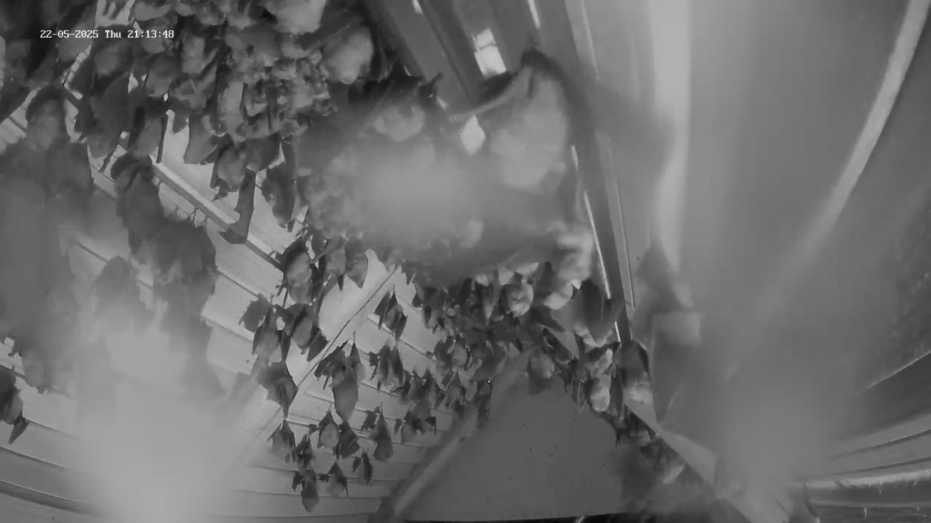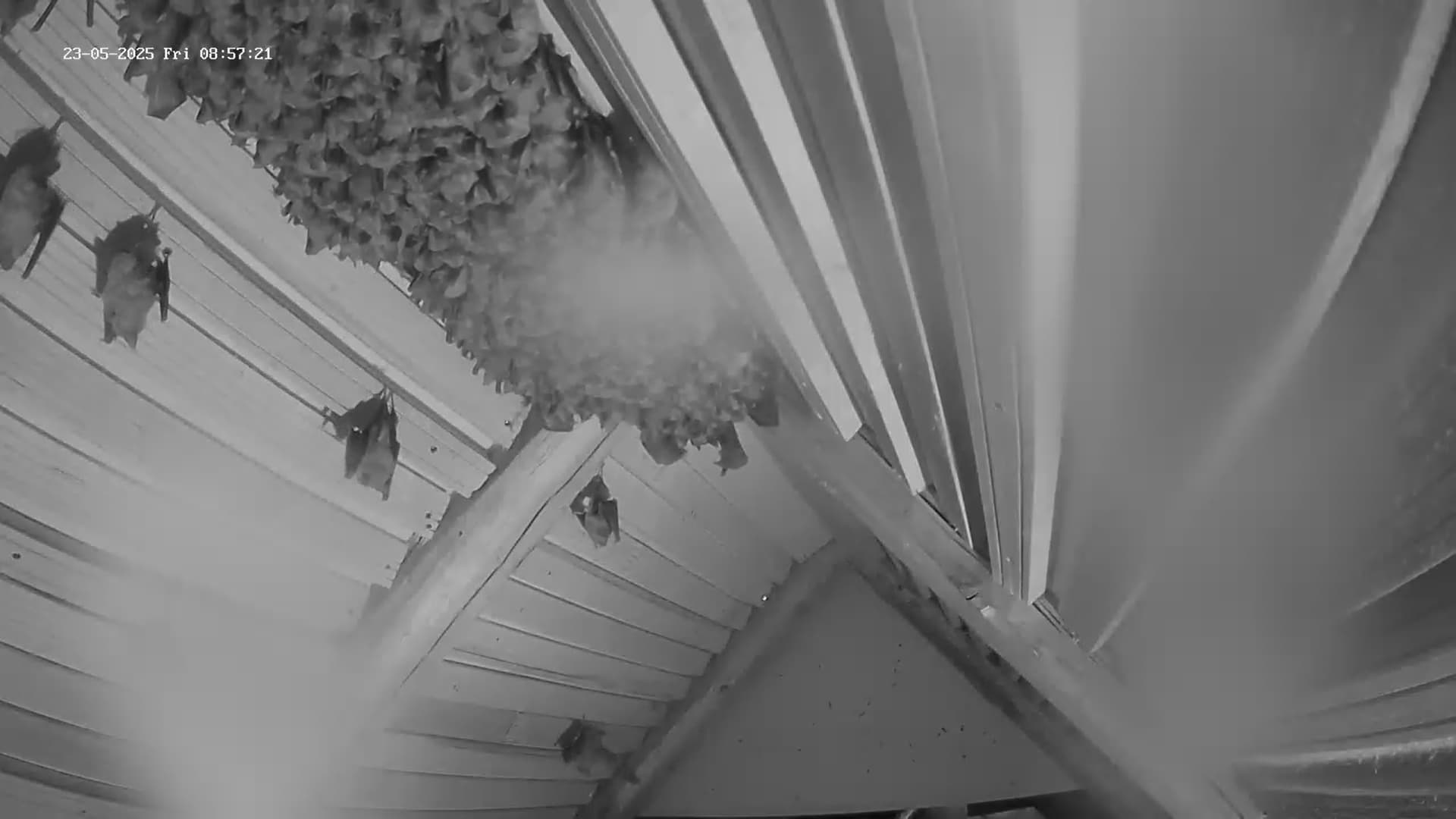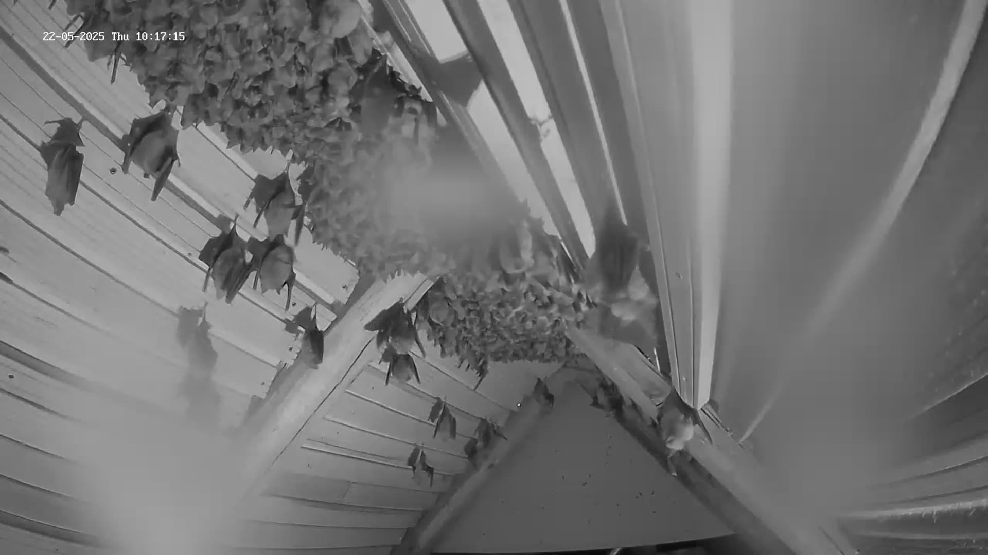Hallo Zusammen, schön dass wir mal wieder neue ZuschauerInnen haben! Jetzt grad um 23:30 Uhr sind schon einige (vielleicht etwa 100) Hufis vom Jagdflug zurückgekommen und sie haben überwiegend gut gefüllte Bäuche. Das ist eigentlich überraschend, weil das Insektenangebot nicht hoch ist. Den Vögeln, die Fluginsekten fangen müssen, geht es gerade nicht so gut. Es sind nur wenige Schwalben und Mauersegler zu sehen, auch den Vogel des Jahres, den Hausrotschwanz, sehe ich kaum, ebenso den Gartenrotschwanz oder Grau- und Trauerschnäpper. Vorgestern habe ich zumindest schon einen Gelbspötter singen hören. Im Lauterachtal oder dem Truppenübungsplatz scheint aber ein Beutetier (oder auch weitere) gut zu fliegen, so dass die Hufis nun erstmal ausreichend Beute finden. Das ist wichtig, weil ja jetzt schon die Hufi-Babys in den Müttern heranwachsen. Früher kamen die Hufis aber meist viel schneller von der Jagd zurück. Jetzt müssen sie schon länger unterwegs sein, um genügend zu erbeuten. Wahrscheinlich werden die Geburten heuer auch etwas später sein, als die letzten Jahre, weil der Mai diesmal ein kalter Mai ist, der deutlich unter seinem langjährigen Mittel ist. Das mit dem fehlenden Regen brauche ich nicht zu wiederholen. Auch heute ist hier so gut wie nichts runtergekommen, während nördlich und südlich immer wieder größere Regenfronten durchgezogen sind. In einer der nächstgelegenen Wetterstationen zu Hohenburg, in Hartenhof, 16 km westlich von Hohenburg hat es in den letzten 3 Monaten nur 35 mm geregnet, also pro Monat nur knapp über 10 Liter. Das wird später auch im Nahrungsangebot der Hufis zu spüren sein, weil sich bei der Trockenheit die Larvenstadien der Insekten nur schlecht entwickeln können. Aber zum Glück ist unsere Kolonie inzwischen so groß, dass mal so ein schlechtes Jahr zu verkraften ist. Und dann müssen wir unseren Hufis noch lernen, nicht gleich immer wieder auf frisch geputzten Kameralinsen zu pinkeln. Saubermachen kann man die dann nur in der kurzen Phase, wo alle auf die Jagd geflogen sind. Servus derweil, Rudi
