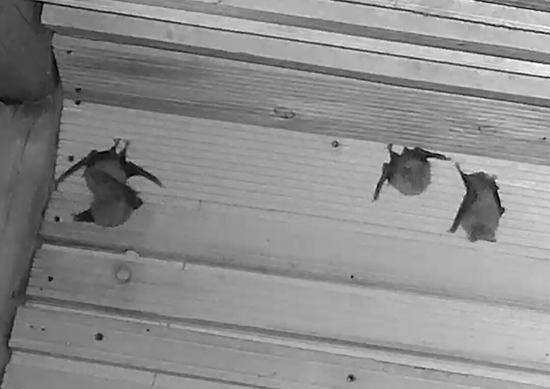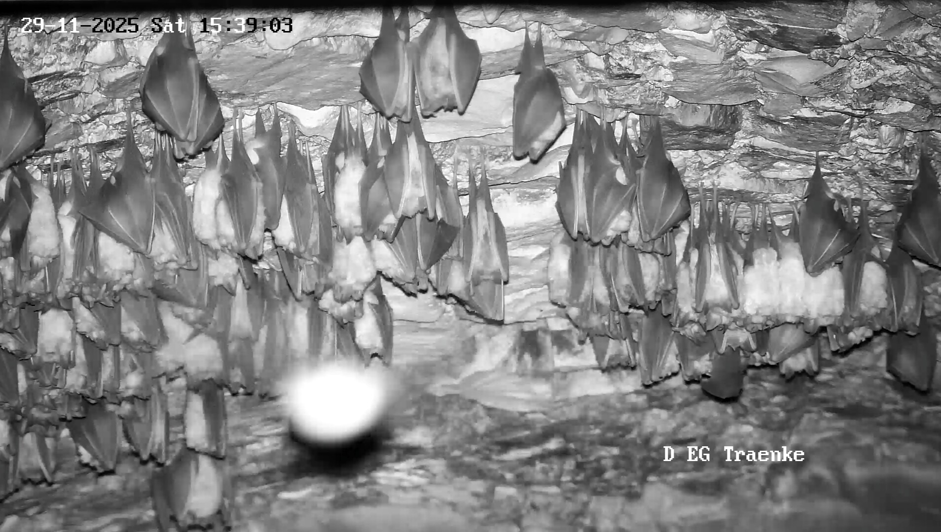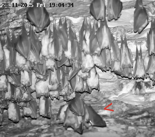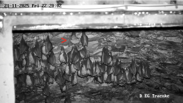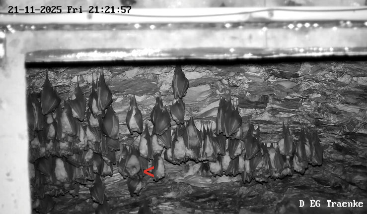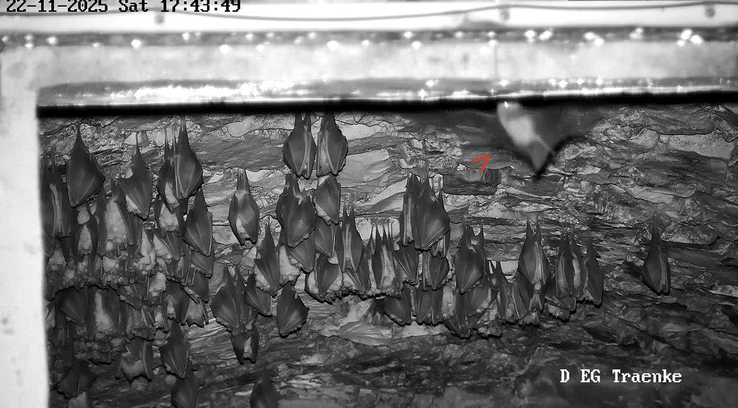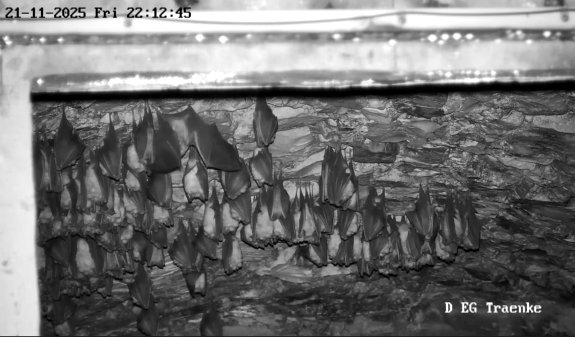 Servus Franz, Danke für Dein Belegfoto, was so los ist in der Wärmeglocke. Ja die letzten Abende waren immer wieder Hufis und auch das Langohr zu sehen. Die Hufis sind vermutlich welche, die aus dem Keller hoch kommen und dann womöglich anschließend das Fledermaushaus verlassen und in ihr letztendliches Winterquartier, einer der Höhlen in der Umgebung, fliegen. Das Langohr kommt anscheinend um hier zu verdauen. Als “Gleaner” (also Fledermäuse, die Beutetiere auch von Oberflächen absammeln) jagen Langohren bis weit in den Winter hinein. Sie können Beutetiere auch von den Felswänden der Höhleneingänge oder von anderen Stellen absammeln, wo sich Gliederfüßer (neben Insekten sind das auch Spinnen und Krebstiere) aufhalten. Ich weiß jetzt gar nicht, ob Alex die Heizung der Wärmeglocke schon abgeschaltet hat. Nachdem wo die Hufis und das Langohr hängen (nämlich links, wo die Heizplatte ist), würde ich annehmen, dass sie noch nicht ausgeschaltet ist. Ich hab grad auf die aktuellen Temperaturen geschaut, und es hat 5,7 Grad. Da können noch Insekten fliegen. Insbesondere der Kleine und Große Forstspanner sind so Schmetterlinge, dessen Männchen um diese Zeit und Temperaturen auch fliegen. Die Fledermausjagd wird aber Dienstag vorbei sein. Es sind Temperaturen bis -5 Grad angesagt und es soll dann bald auch den ersten Schnee hier geben. - Das was Du auf der Außenkamera gesehen hast, dürften große Nebeltropfen gewesen sein. So etwas konnte man die letzte Zeit öfter sehen. Es sieht aus wie Schneetreiben, aber es sind feine Wassertröpfchen, die durch das Anleuchten mit den IR-Dioden deutlich größer wirken als sie sind. Servus derweil, Rudi