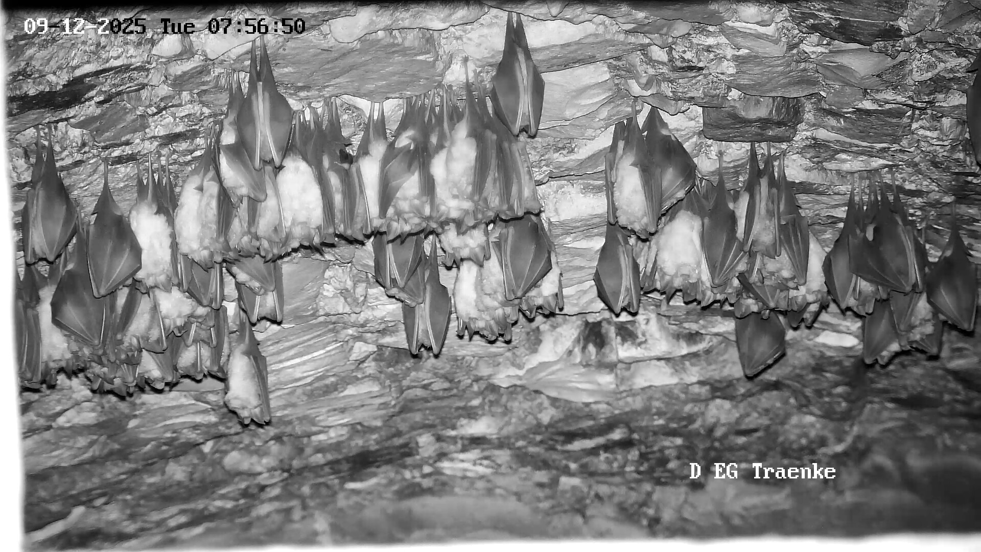 Ich war vormittags auch drin, und es war ruhig. Den Rest des Tages war ich so von Telefonaten und Konferenzen eingenommen, dass ich jetzt erst beim Verlassen des Schreibtischs noch hineinschauen konnte. Und nun finde ich das vor!! Allerdings gehen bei mir grad die Kameras nicht richtig, erst ging gar keine, dann nur die Tränkekamera und nun auch die beiden oberen, aber die Kellerkamera geht jetzt immer noch nicht, und jetzt doch auch. Ich habe den Eindruck, dass hier nun weniger Hufis hängen. Bei den momentanen Temperaturen von 9 Grad (jetzt um 0:50 Uhr!) sind die vermutlich zum Jagen ausgeflogen. Bin gespannt, was morgen früh im Keller hängt? Servus derweil, Rudi