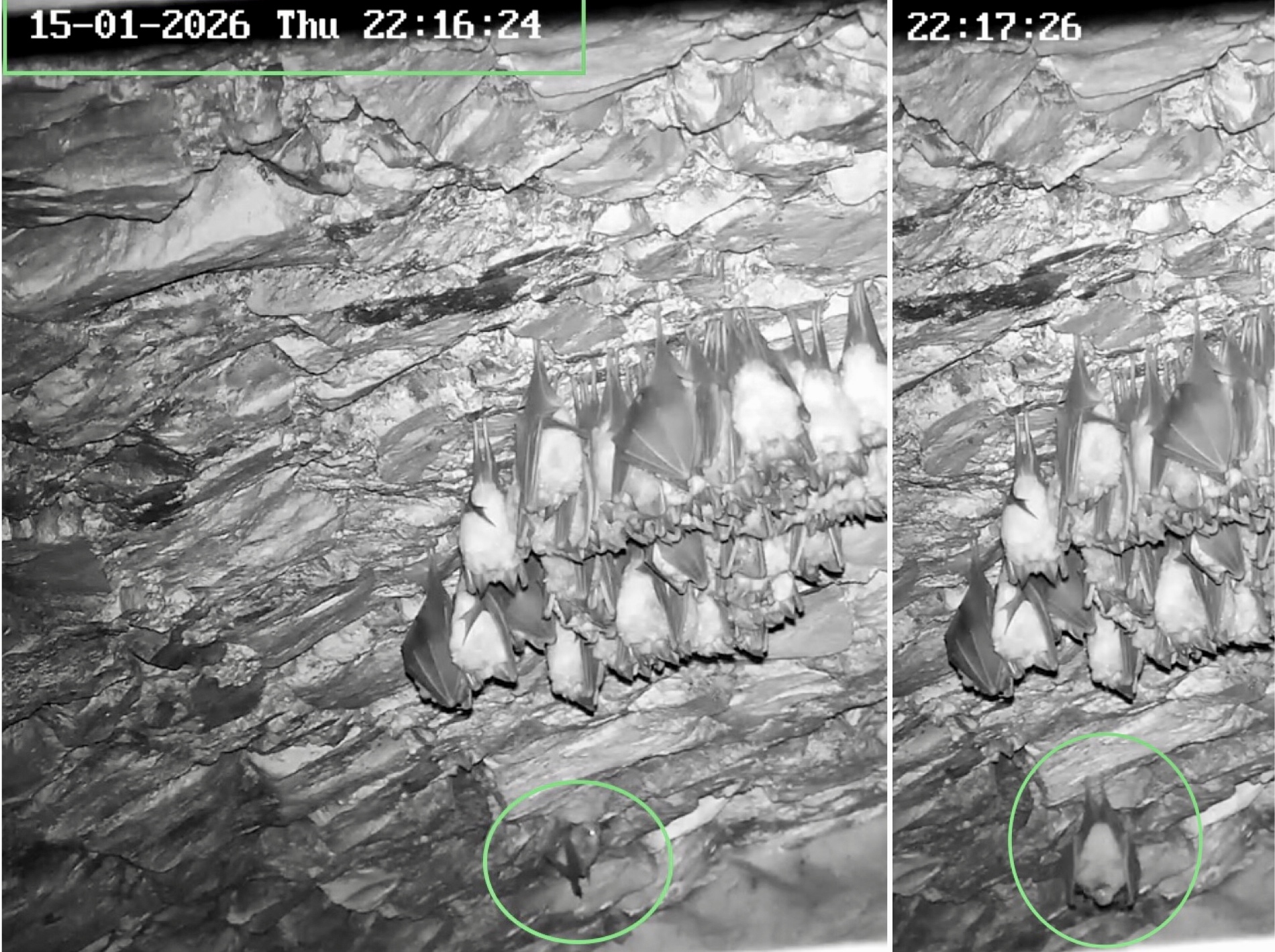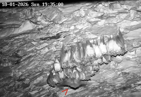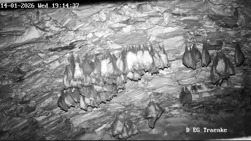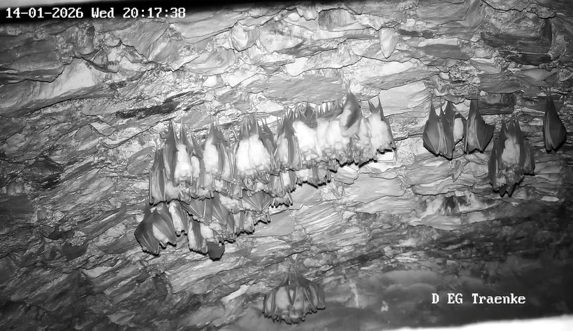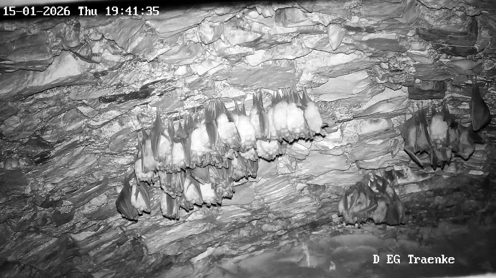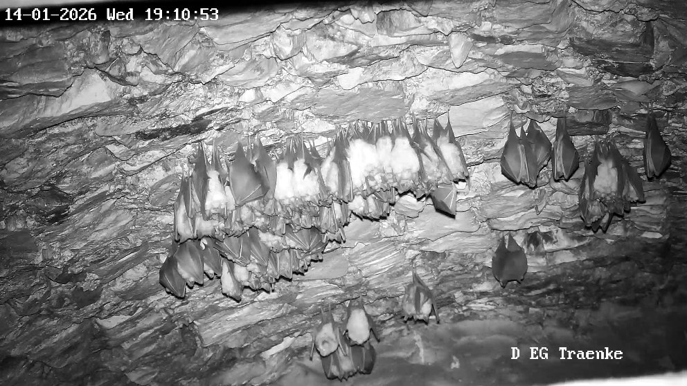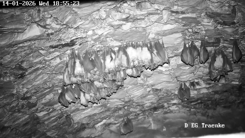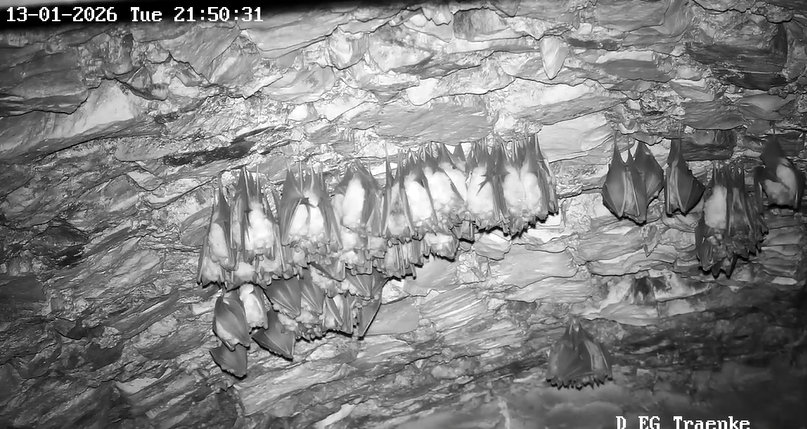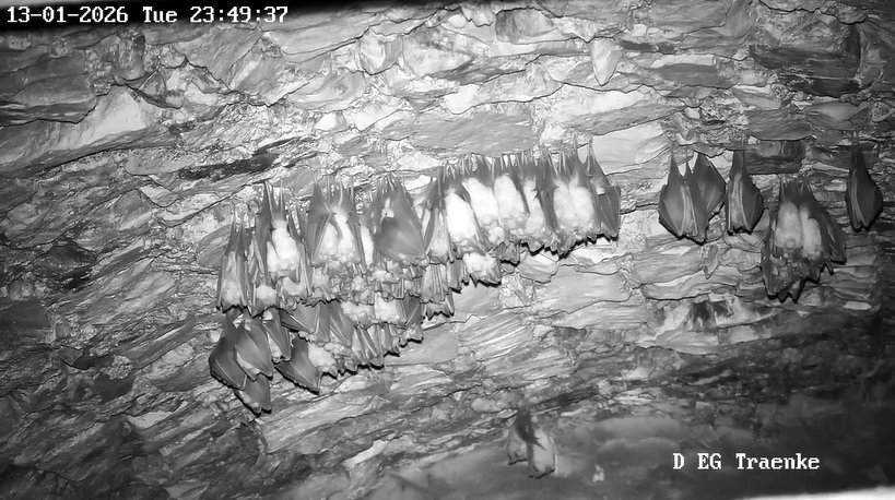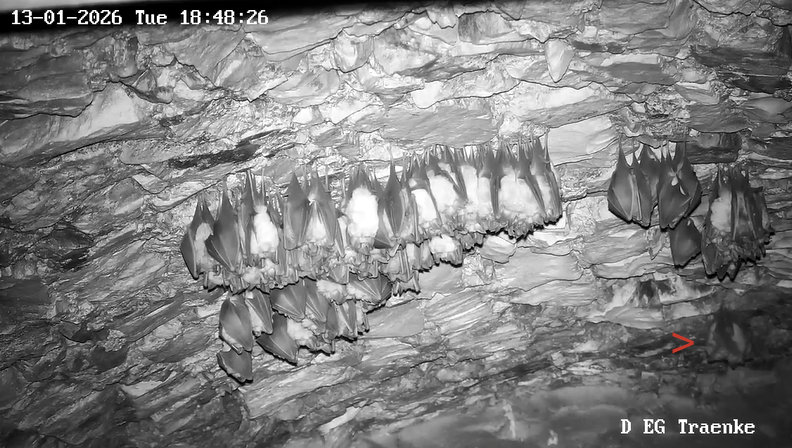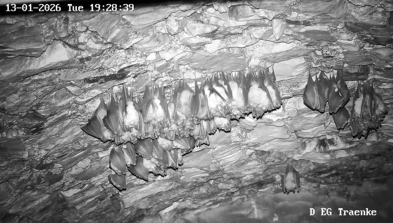 Eine einzige Hufi hat heute am dritten Tag den Kälteschlaf unterbrochen und war ab 18:10 aktiv. Zuerst flog sie durch die Erdhalle und zur Tränke, dann war sie zwischen den schlafenden Hufis unterwegs. Nach einer guten halben Stunde Pause war sie erneut an verschiedenen Hangplätzen und es war nicht zu erkennen, ob es ihr um den Hangplatz ging oder um die dort hängenden schlafenden Hufis. Vielleicht war es ein paarungswilliges Männchen? Jedenfalls sorgte sie für ordentlich Unruhe bei den anderen…