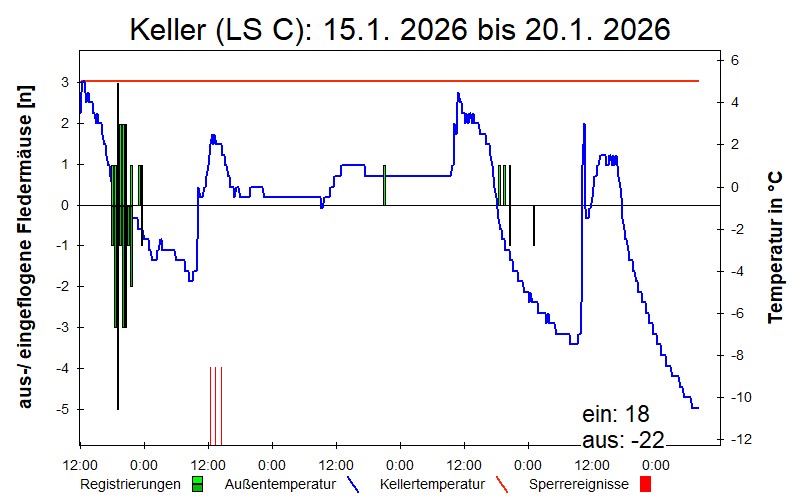 in der Oberpfalz ist es kalt und diese Kälte kriecht auch in den Keller des Fledermaushauses, trotz des Wärmevorhangs. Gestern Früh ist die Temperatur auf -4,5 Grad gefallen. Jetzt müssen wir die Temperatur und das Verhalten der Hufis gut beobachten. Noch etwas kälter war es 2017. Da war die Temperatur am 22.01. schon auf 3,5 Grad gefallen. Sollte die Temperatur noch weiter fallen, könnten einige Hufis dieses Quartier verlassen. 2017 fiel die Temperatur kurz mal auf 3,0. In dieser Zeit verließen 10 von den 25 Hufis, die damals darin hingen, das Quartier. Später waren dann nur mehr 9 Hufis im Keller geblieben. Der Januar 2017 hatte in der Region eine Durchschnittstemperatur von - 5,8 Grad. Derzeit sind wir bei - 3,3 Grad. Das dürfte aber noch niedriger werden. Für den heutigen Tag liegt die bisherige Durchschnittstemperatur bei -11,3. Es könnte vielleicht der kälteste Tag des Jahres werden. Bisher ist das der 6. Januar mit -10,2 Grad. Die Hufis in den tiefen Höhlen stört das nicht. Der Keller ist aber noch kein frostsicheres Quartier. Das wollten wir aber noch hinbringen, ohne dass wir eine Beheizung einsetzen. Und das kriegen wir auch hin. Servus derweil, Rudi