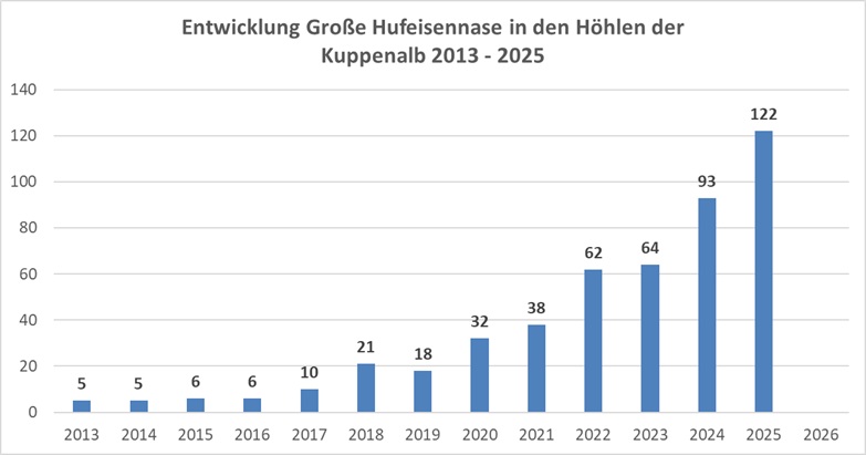 In der sogenannte Kuppenalb oder Hersbrucker Alb, die sich in etwa im Dreieck der A9, der A6 und der B85 befindet, war auch die Große Hufeisennase schon verschwunden (letzte Nachweise 1985). Aber ab 2013 begann die Wiederbesiedlung der Höhlen in dieser Region von der Hohenburger Kolonie aus, als diese deutlich zunahm. Seither ist die Zahl der in diesem Gebiet überwinternden Großen Hufeisennasen von 5 im Winter 2013 auf 122 vergangenen Winter gestiegen. Der Großteil fliegt nach dem Winterschlaf aber wieder nach Hohenburg zurück. Es bleiben aber auch einige (v.a. Männchen) ganzjährig in diesem Gebiet. Wir hoffen, dass sich hier bald eine eigene Wochenstube bildet…..