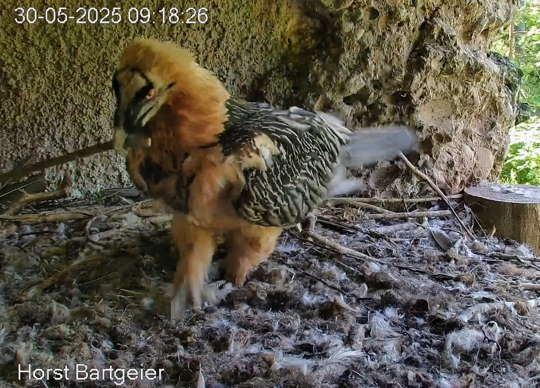 Das dürfte noch von der Mauser sein @Recka. Hans macht die Mauser jeweils während der Brut- und Aufzuchtzeit durch und hat währenddessen auch zu wenig Zeit für die Gefiederpflege (Auskunft Dr. Wehrle, ehem. Tierarzt in Goldau).