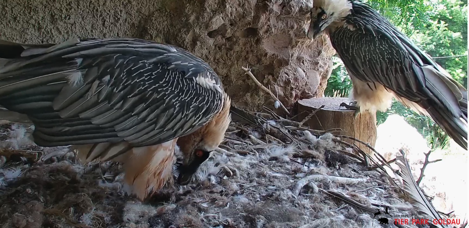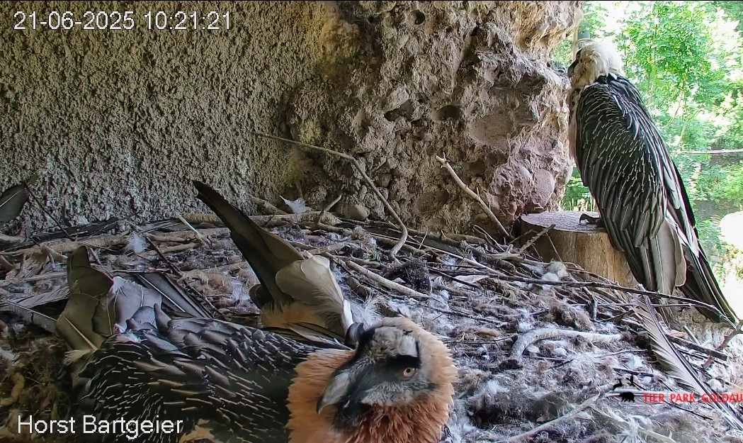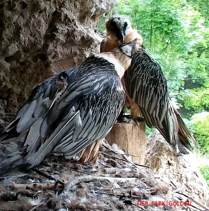 Hans hat sich ein kleines Schläfchen gegönnt und wird wieder munter. Derweil hat Mascha ihr Gefieder gepflegt und wird so langsam müde. Die beiden haben jetzt viel Zeit für sich selber.