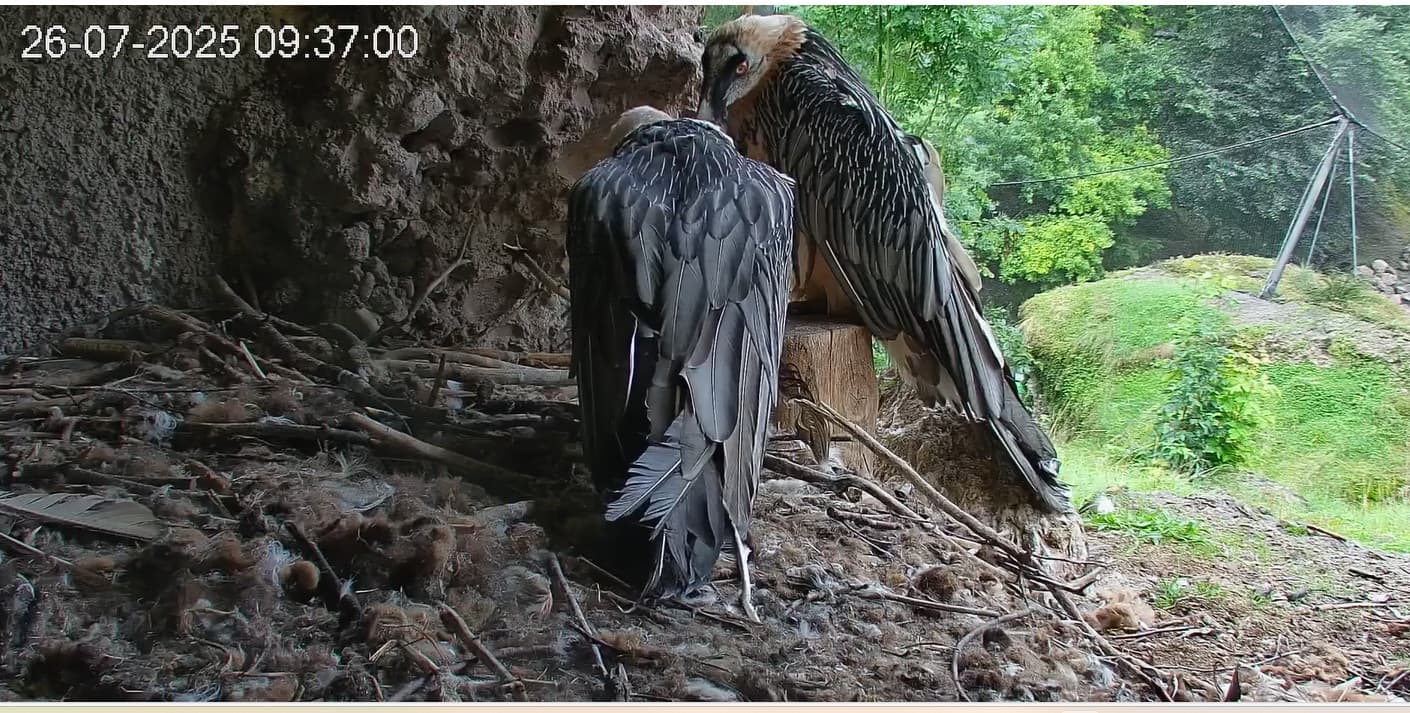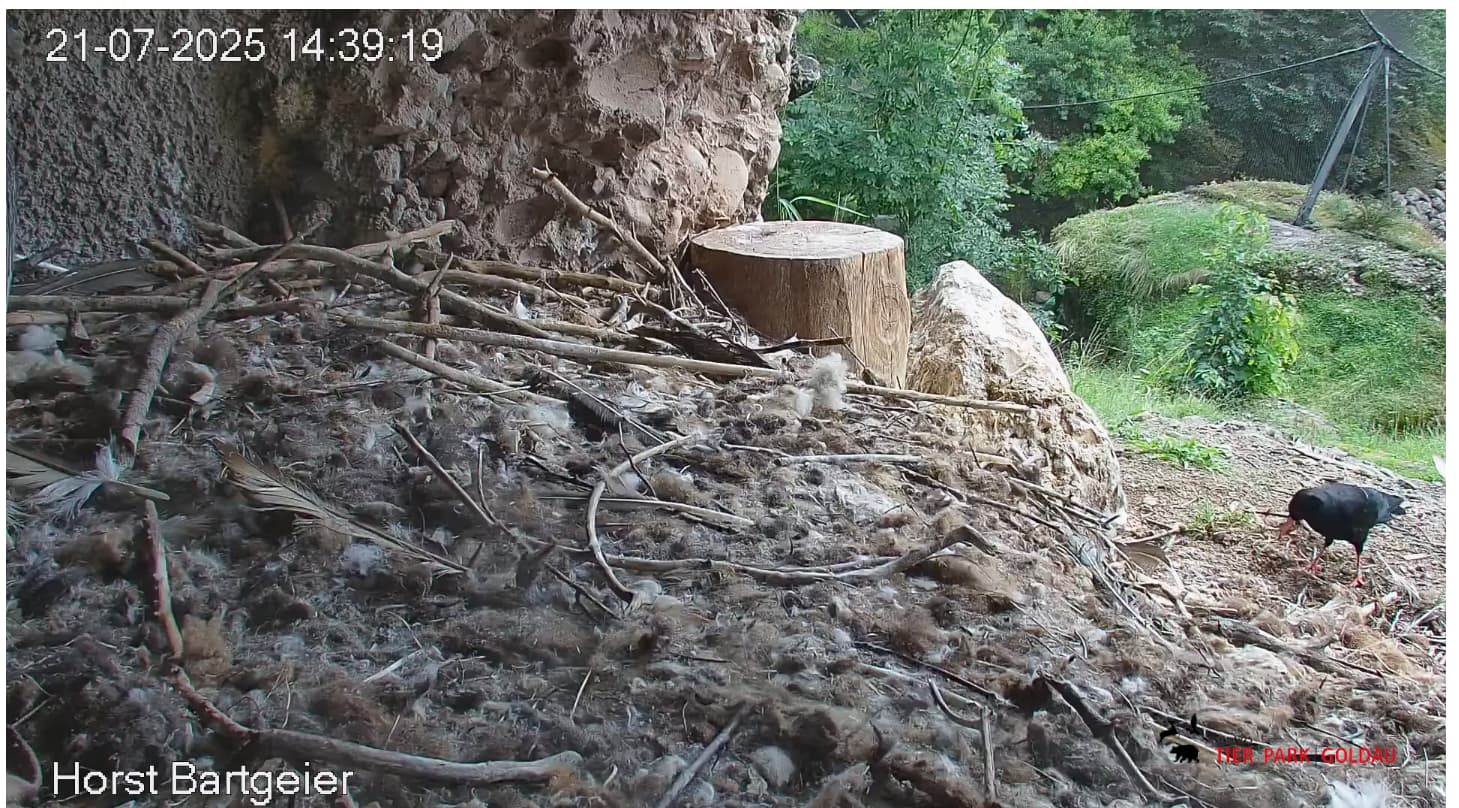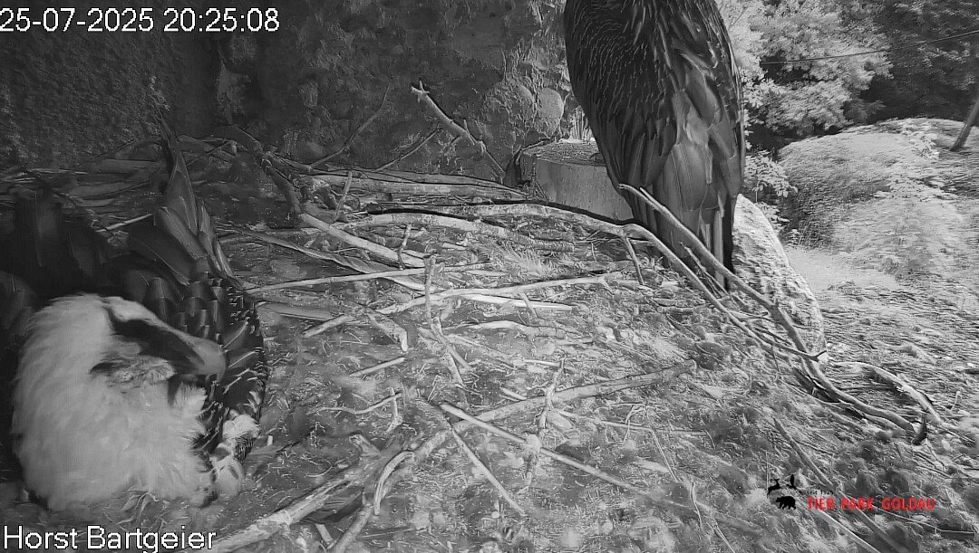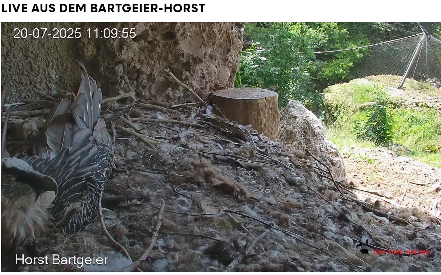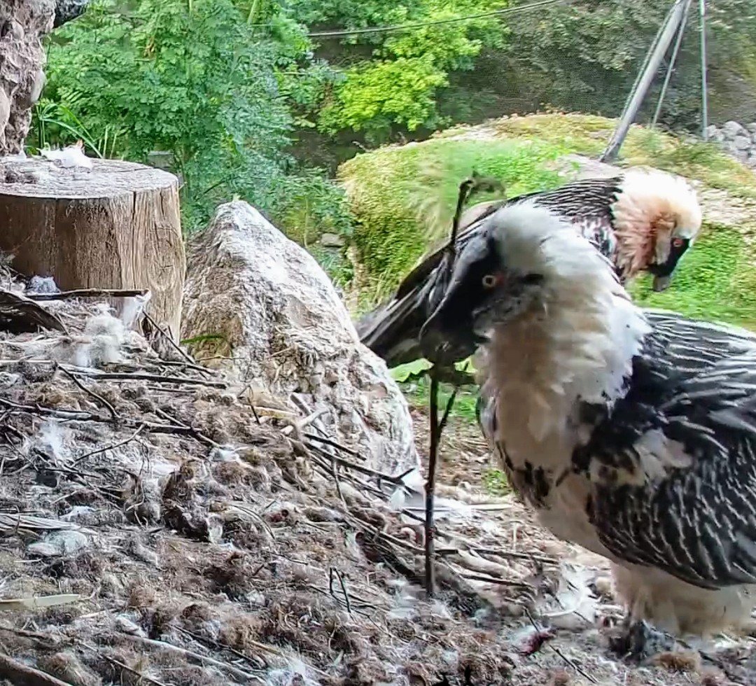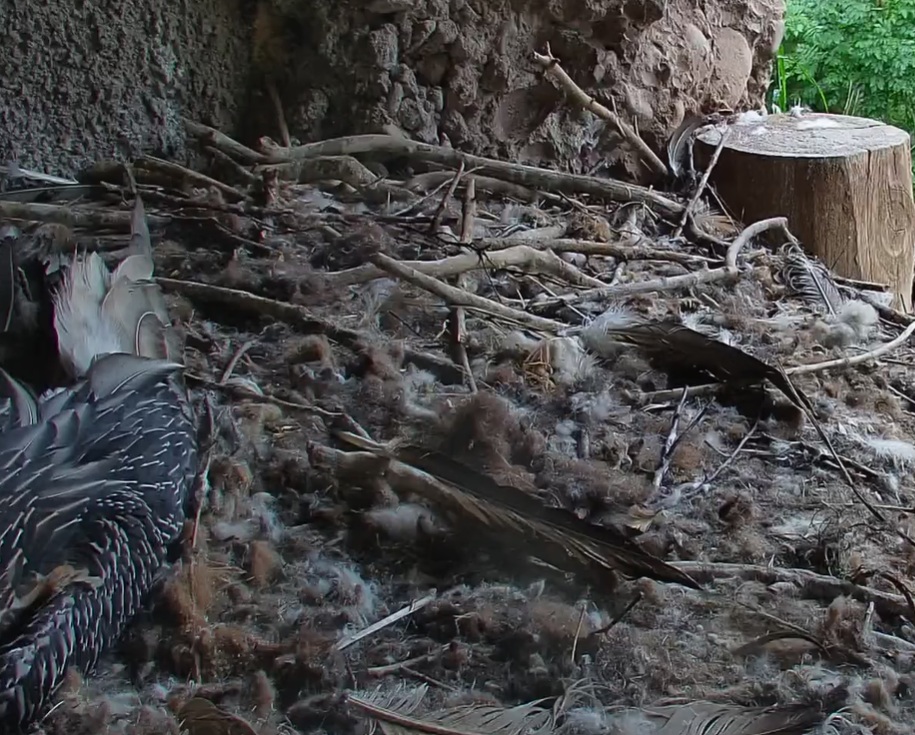 Jetzt ist es Mascha, die im Horst sitzt. Sie hält sich dort tagsüber gerne im Schatten auf, während Hans im Gelände herumstreift.