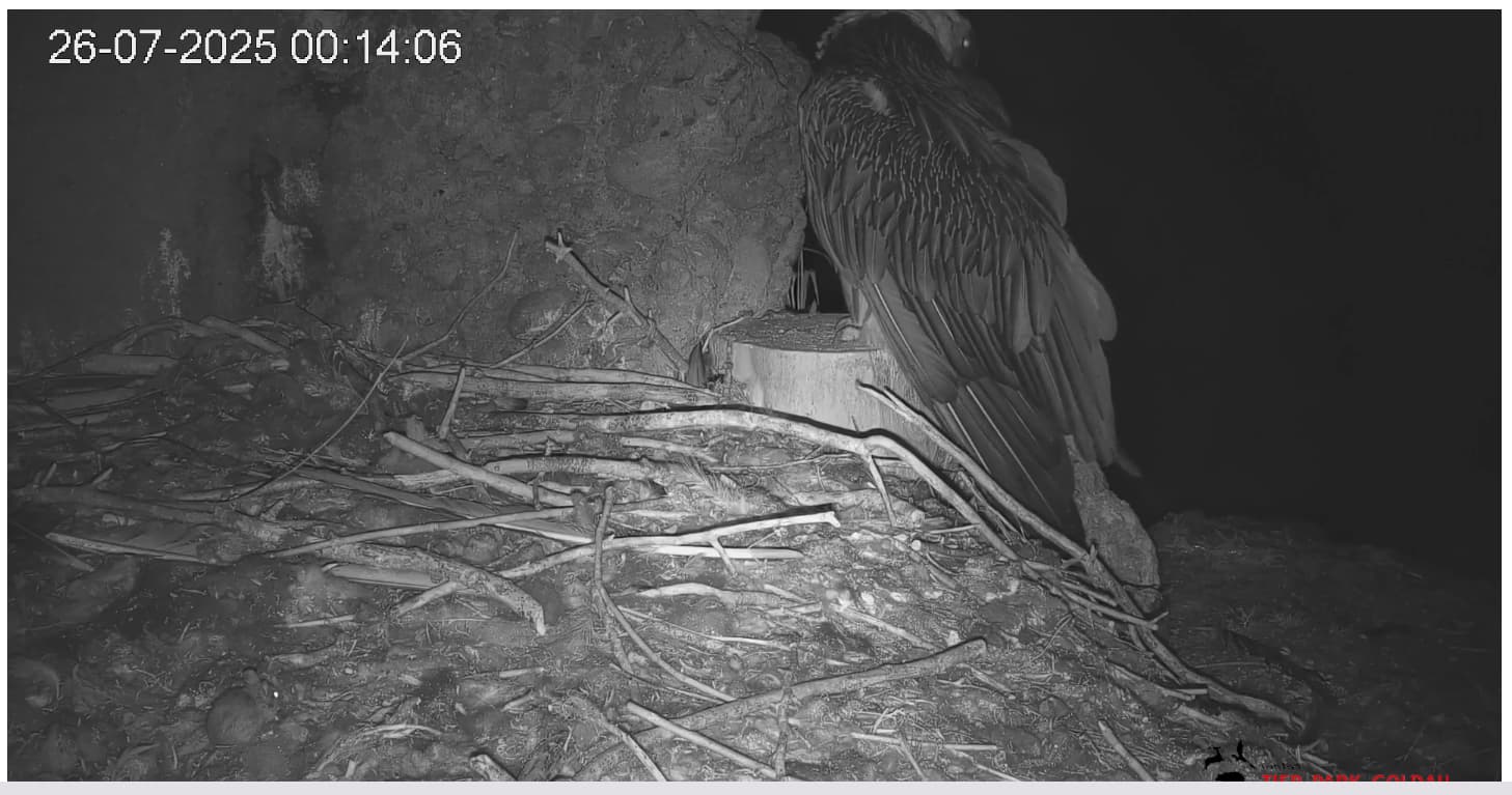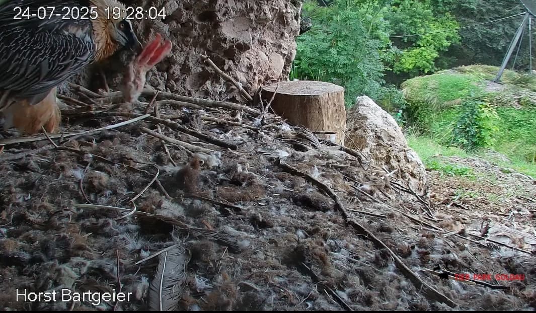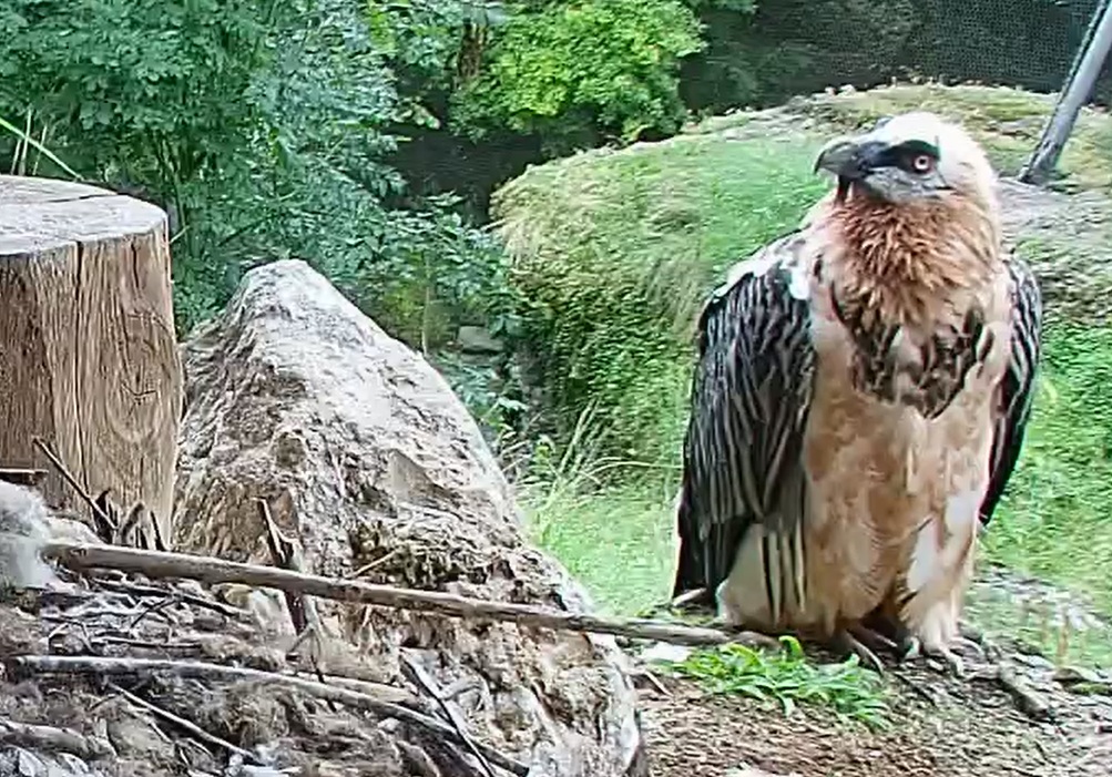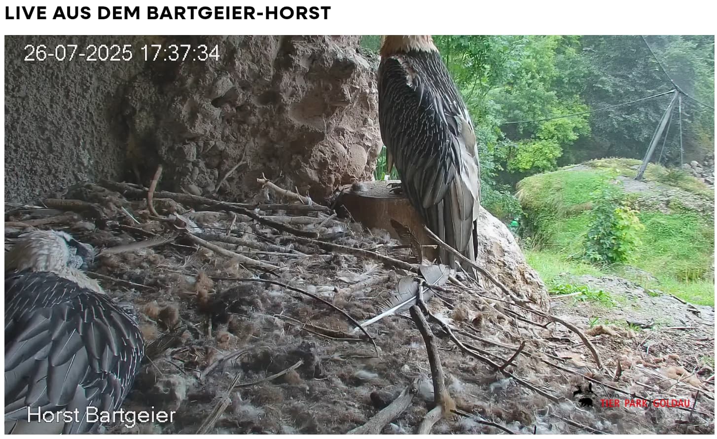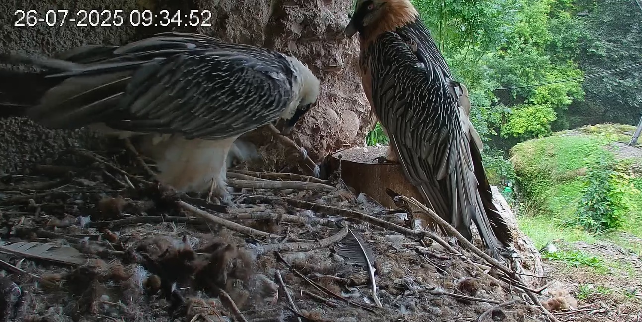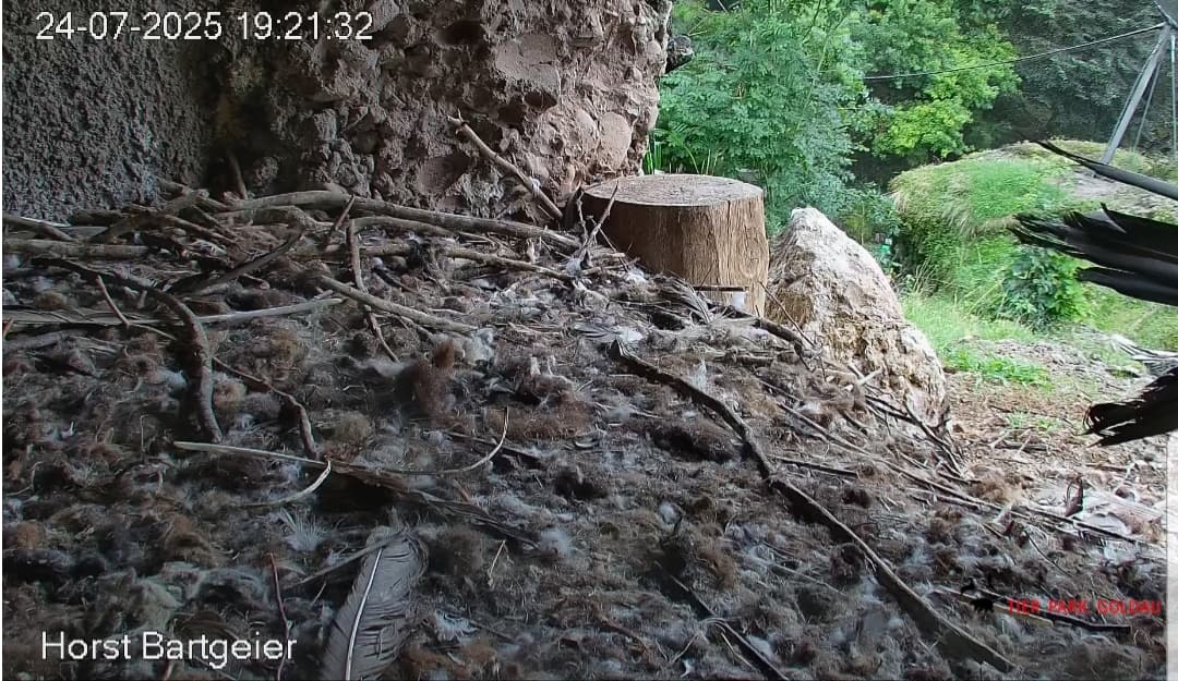 Jetzt ist es Mascha, die im Horst sitzt. Sie hält sich dort tagsüber gerne im Schatten auf, während Hans im Gelände herumstreift.