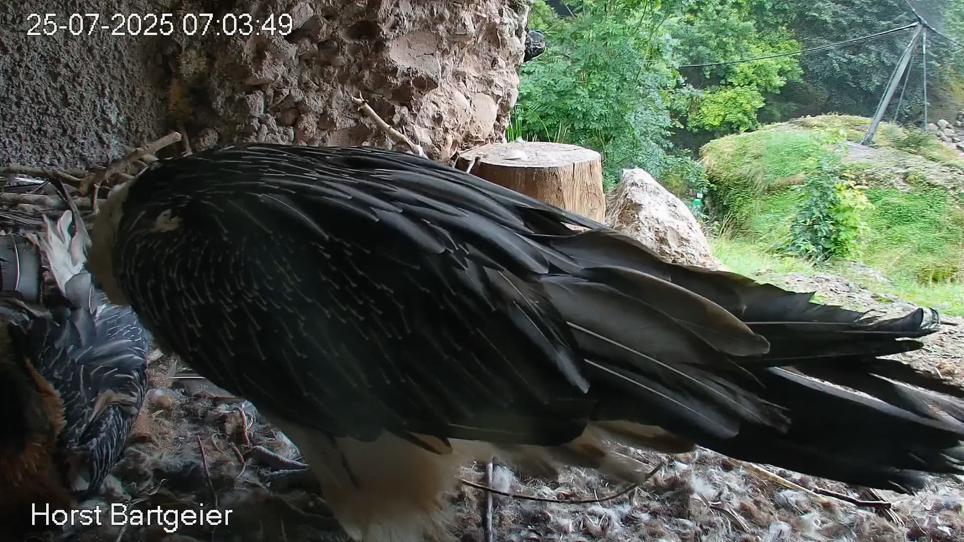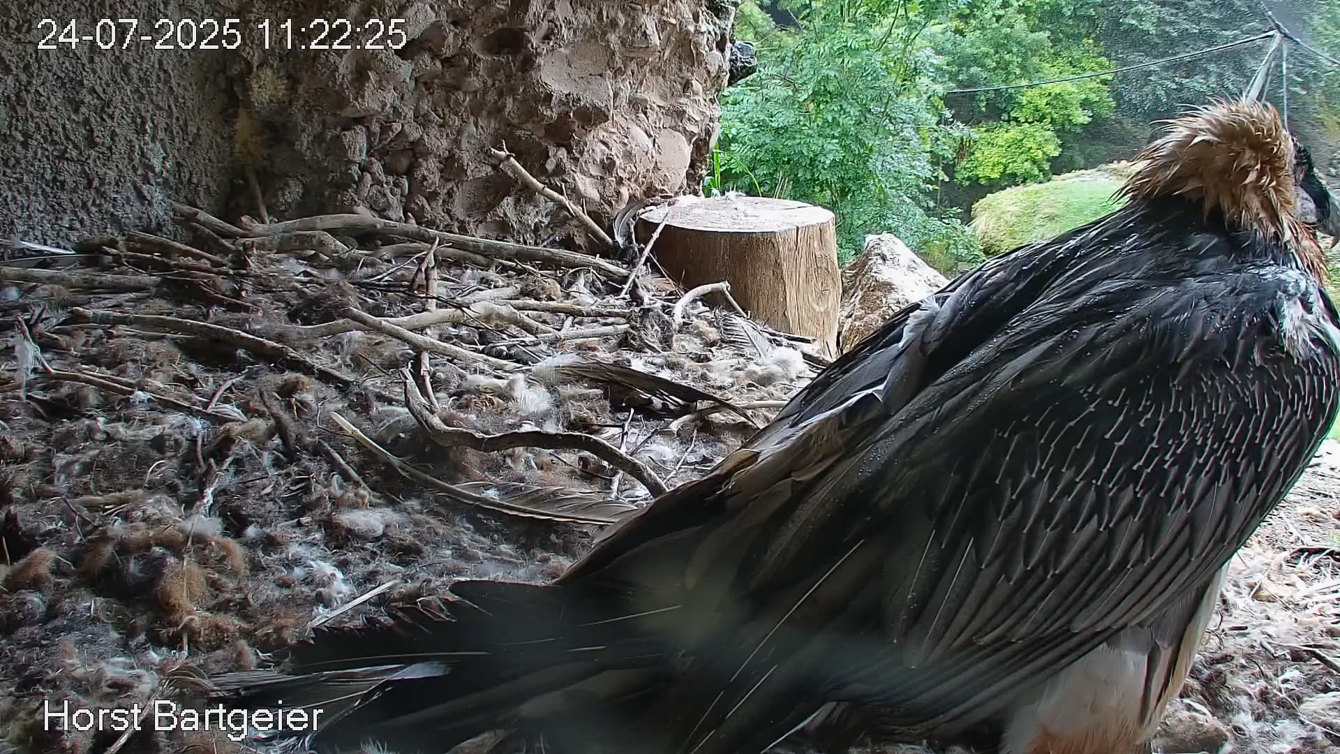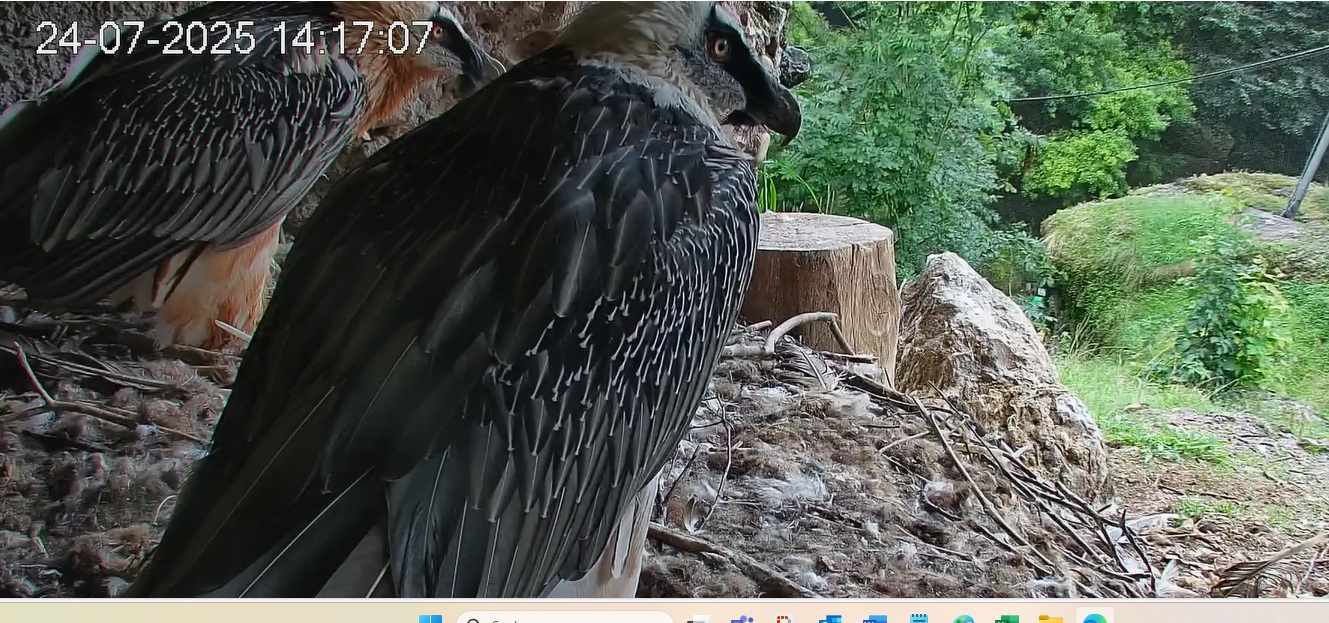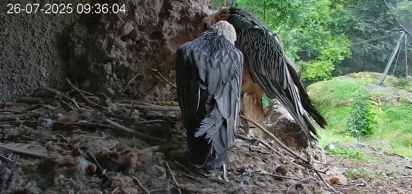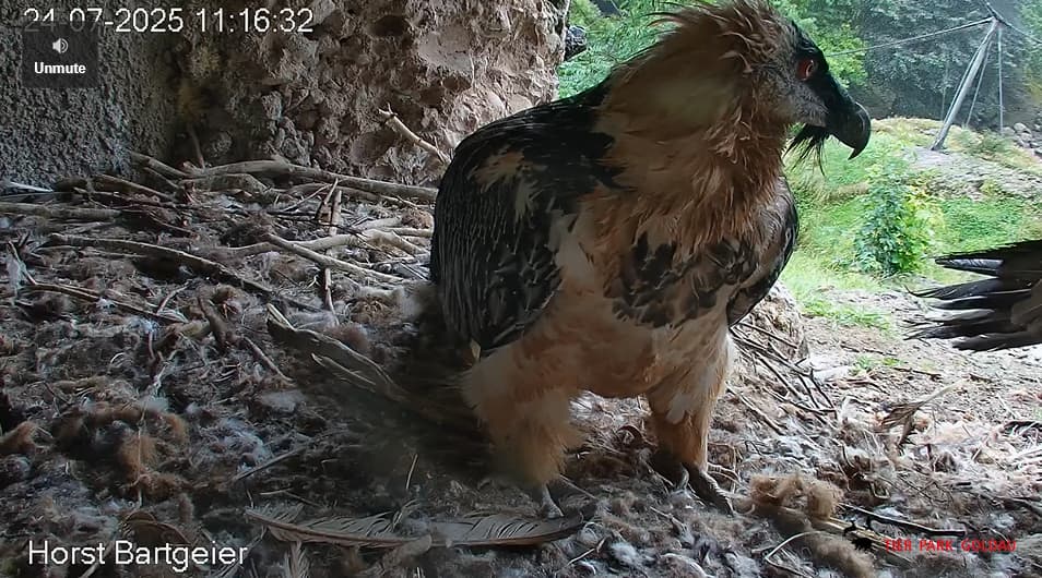 Jetzt ist es Mascha, die im Horst sitzt. Sie hält sich dort tagsüber gerne im Schatten auf, während Hans im Gelände herumstreift.