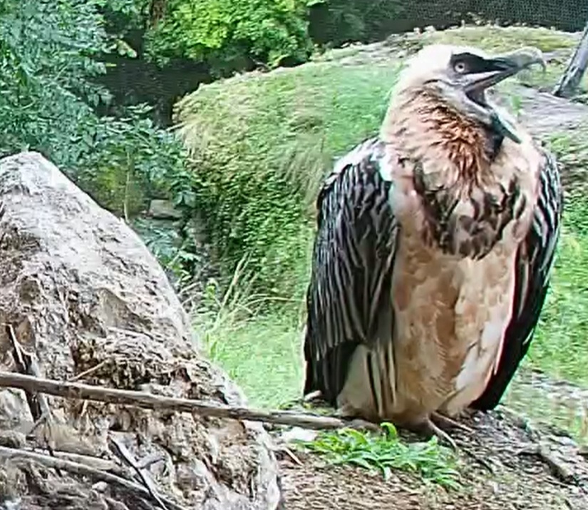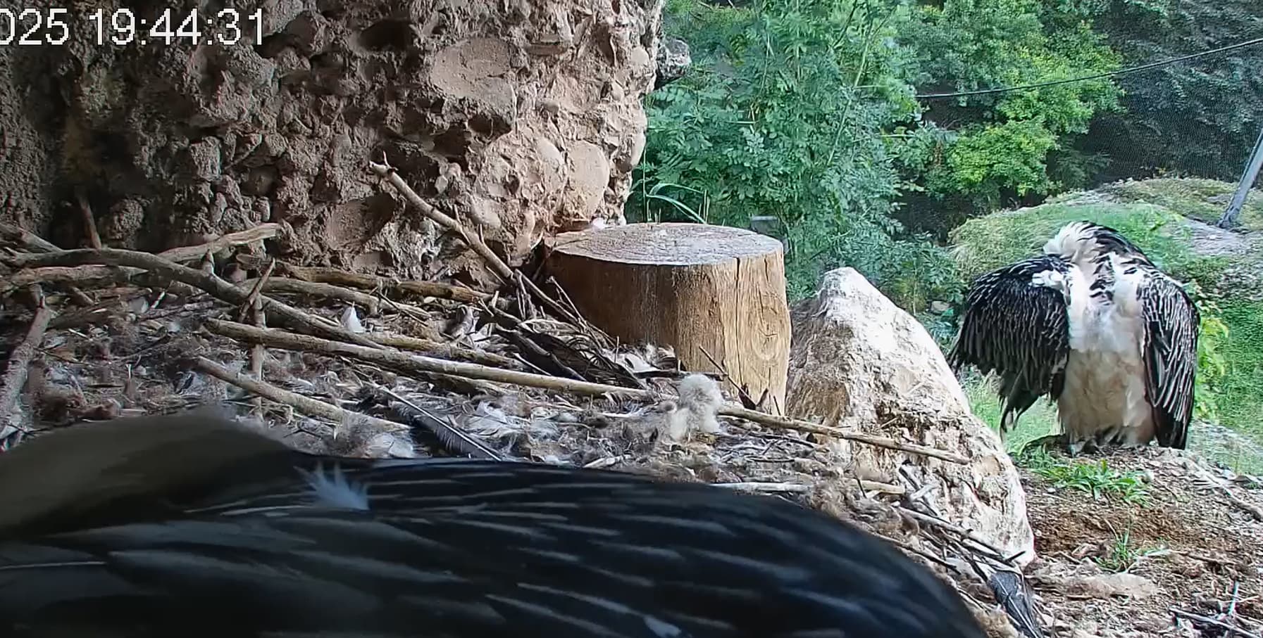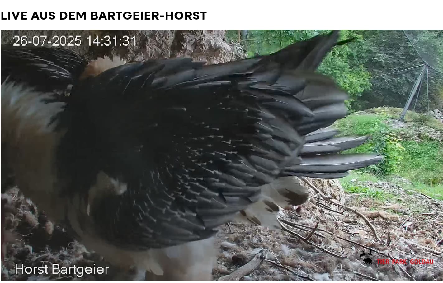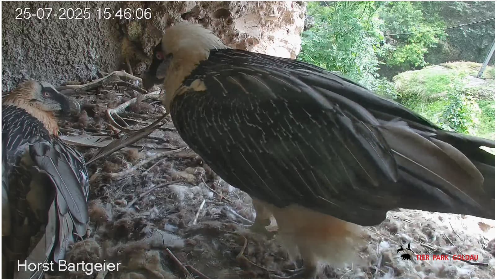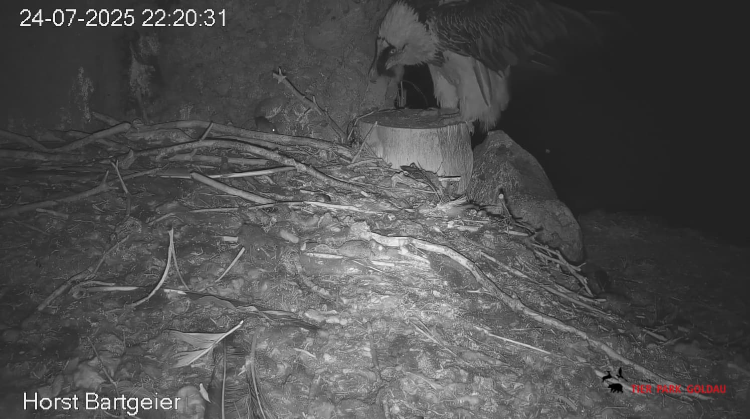 Jetzt ist es Mascha, die im Horst sitzt. Sie hält sich dort tagsüber gerne im Schatten auf, während Hans im Gelände herumstreift.