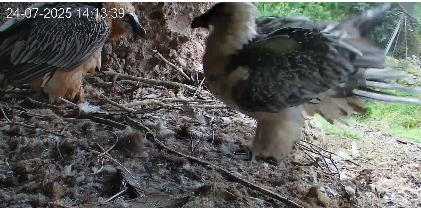 Hans hüpft elegant zu Mascha in den Horst, die sich gerade ihrer Brotzeit widmet.