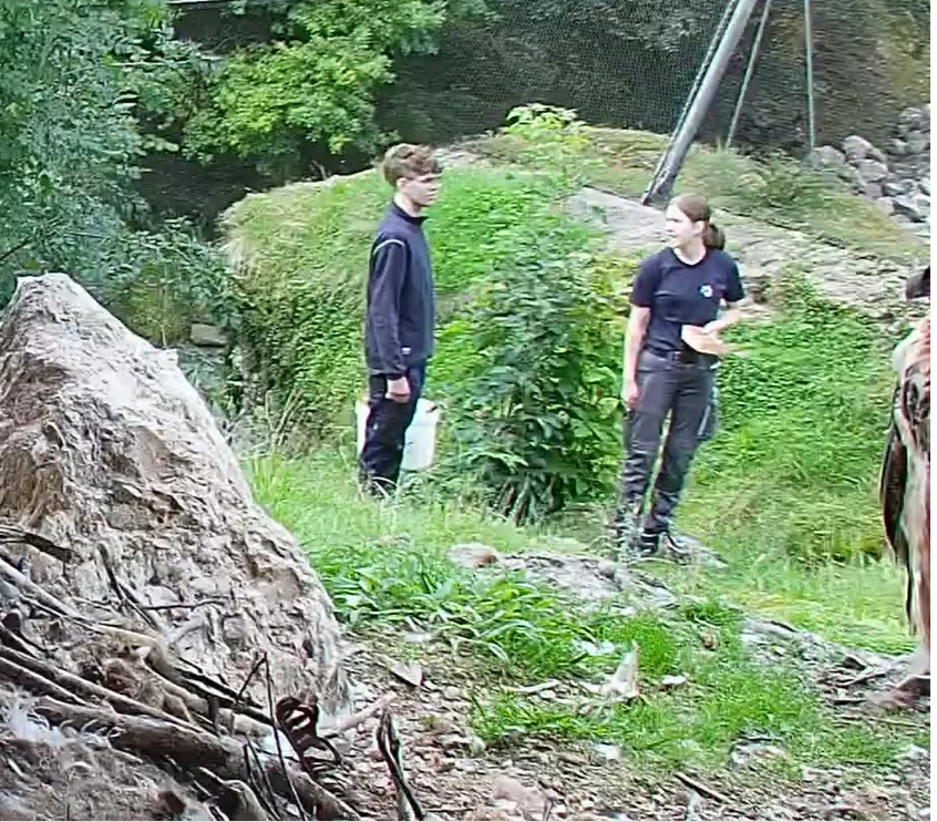 2 Menschen mit Eimern im Revier. Das kennen die Bartis und betrachten in Ruhe das Geschehen. Dann muss Hans aber doch am Futterplatz nach dem Rechten sehen und Mascha folgt ihm.